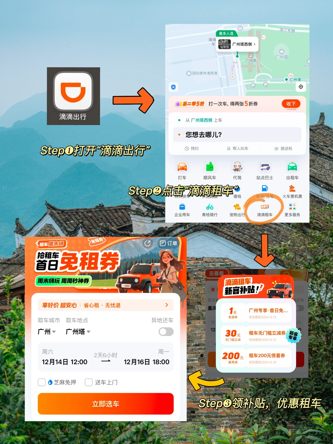 ▪️重点是!📅12.4-12.31广州地区租车还有首日0租金的大羊毛!相当于滴滴租车直接买单一天的出行,省一天钱,自驾多玩一天~