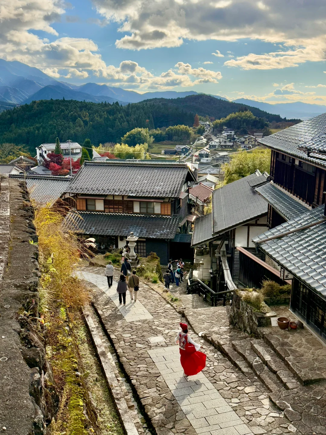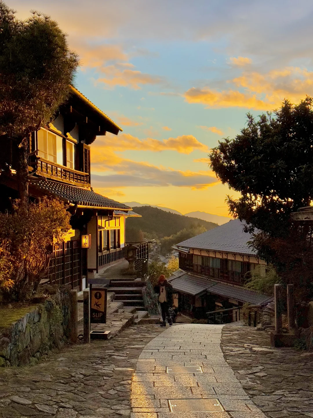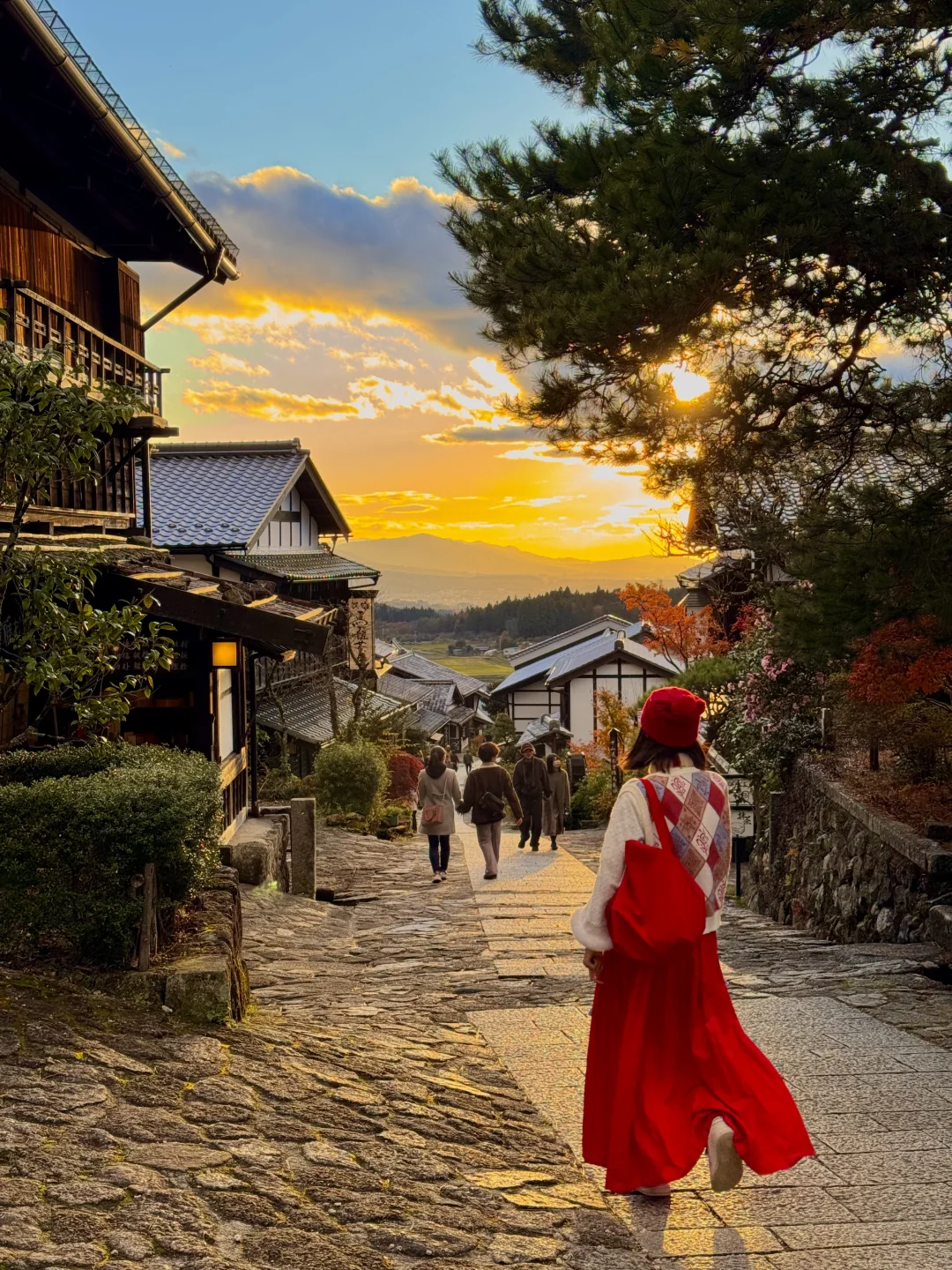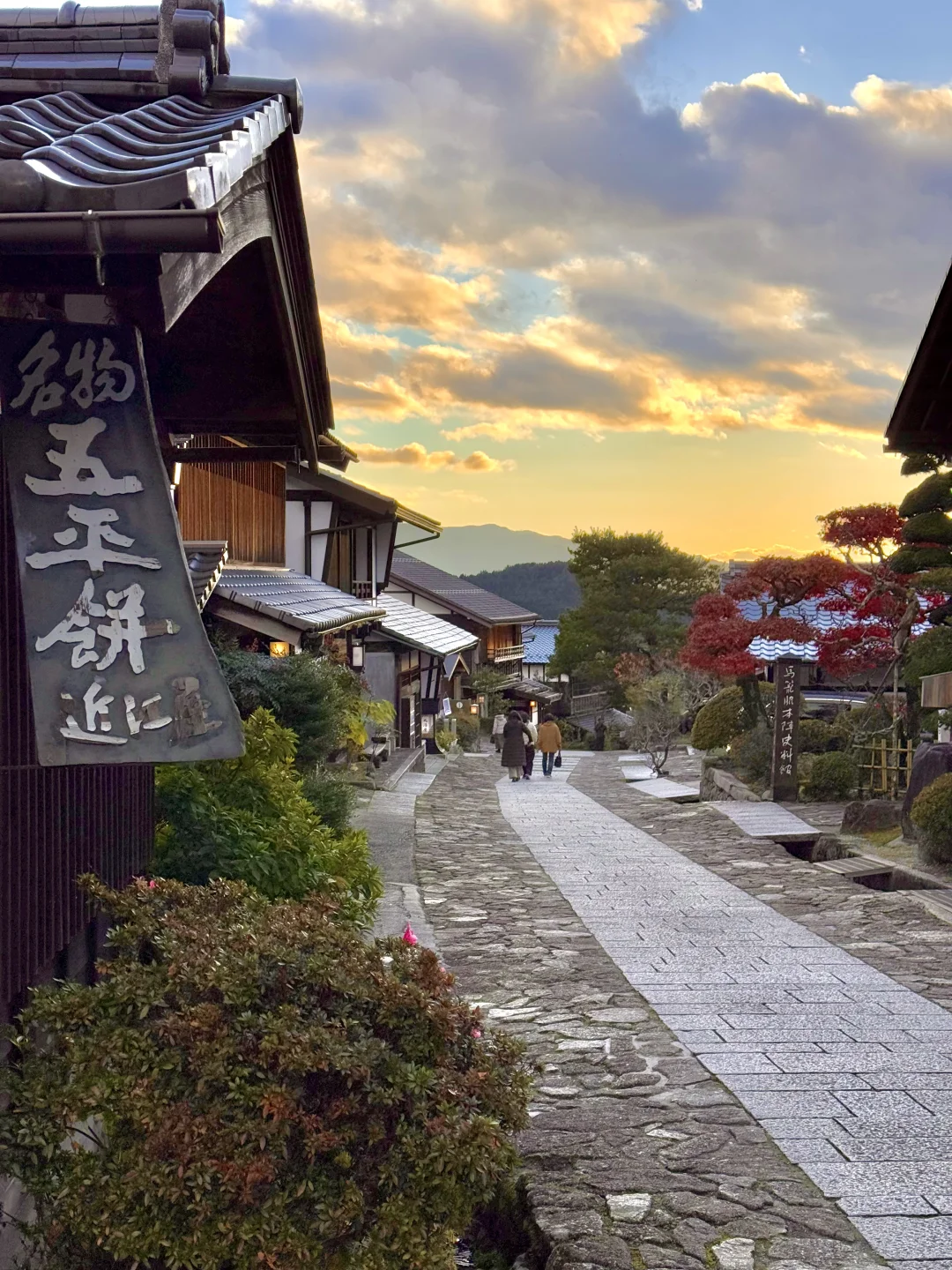 🔸马笼宿街道:一条长长的斜坡石板路,保留了江户时代城镇的昔日风貌,两旁是茶屋和咖啡店,文艺感满满~下入口拐角处的红叶石板路被