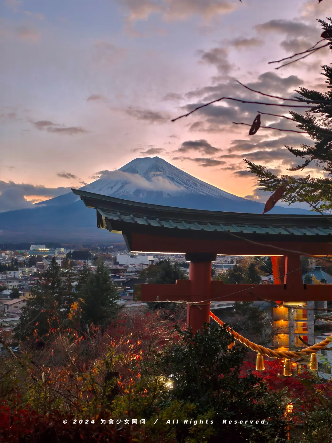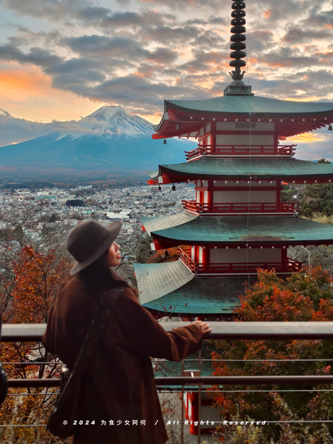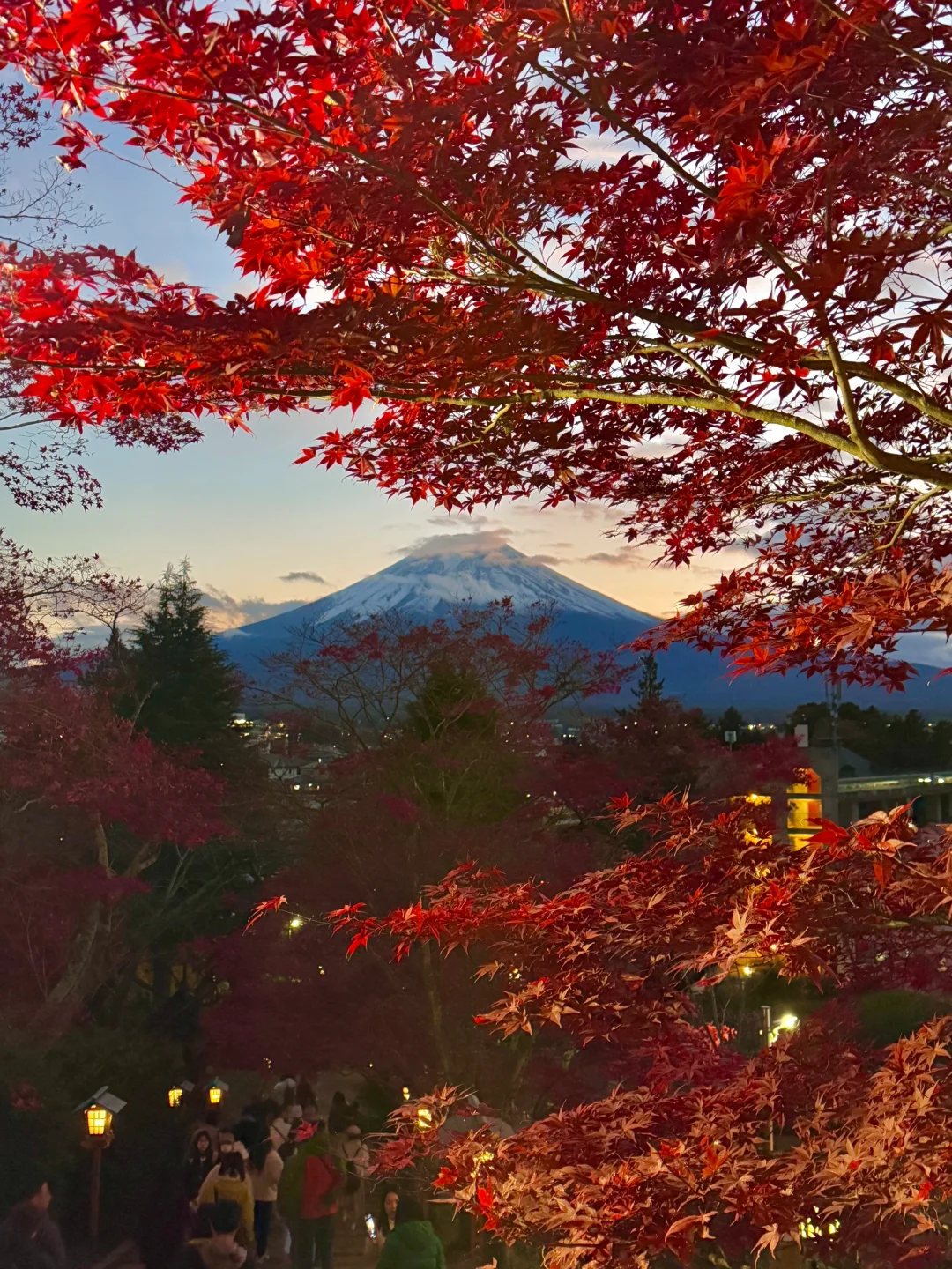沿着石阶上去,富士山与红叶、鸟居、五重塔以及晚霞组成的画面绝美!三月还有樱花🌸