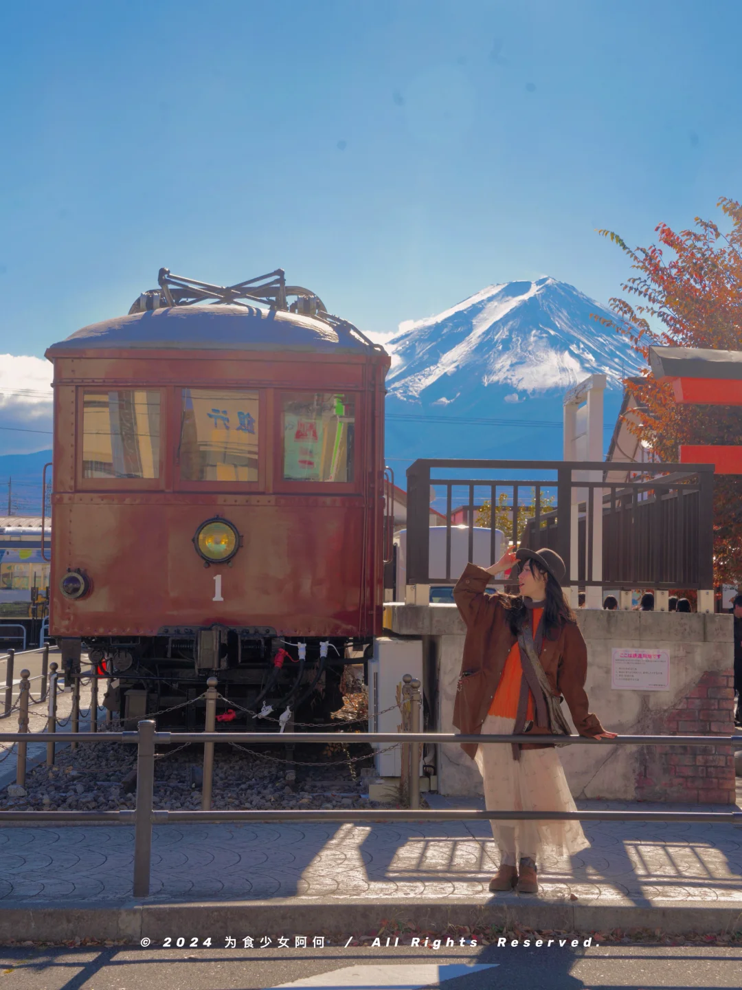 有红叶、芦苇海、火车还有鸟居相衬