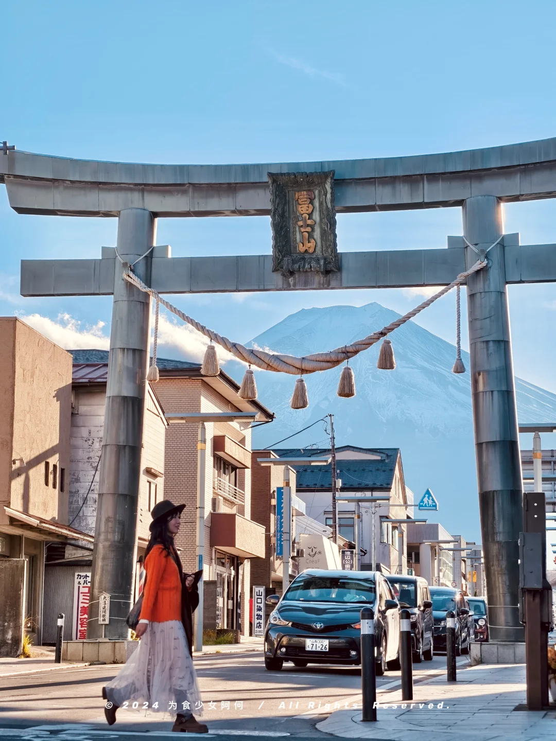巨大的鸟居把富士山和安静的街道框成画卷