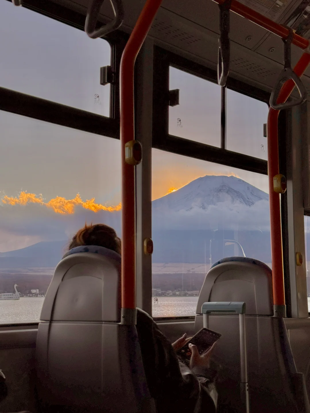 山中湖前往河口湖的巴士,沿途窗户一直映照着富士山