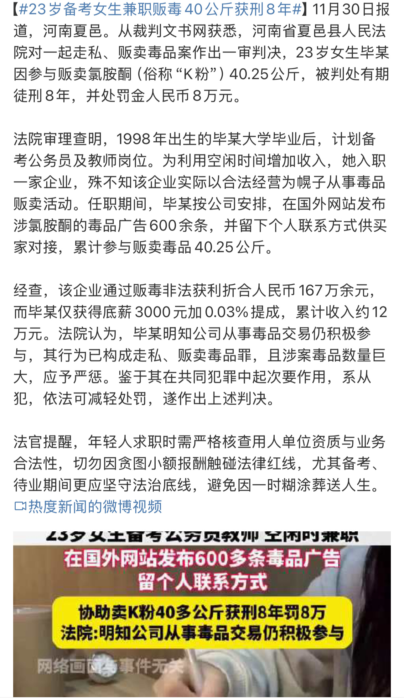 这两天涉毒犯罪热度高,有这样一个新闻引起了关注→_→23岁女生毕业后计划备考,利用空闲时间协助卖“K粉”40多公斤,底薪3000元,犯走私、贩卖毒品罪一审获刑8年有很多人疑惑40公斤K粉为什么只判了8年,我来解释一下吧,最高人民法院刑一庭《关于审理若干新型毒品案件定罪量刑的指导意见》里面有个规定,毒品的认定,是以海洛因为标准的1克海洛因=1克甲基苯丙胺(冰毒)=20克K粉,所以40公斤K粉等于2公斤海洛因。按照刑法,确实是50克海洛因就能判死刑,但是实务中几乎不可能,一般来说都要公斤级以上,在某些毒品案件泛滥的地区还会更高,当然在一些毒情没那么严重的地区会降低,而且还要主犯才能判死刑立即执行,一个案件判两个死刑的案例都少之又少。所以这个案例中,这个女的是从犯,再加上其他一些因素,所以只判了八年。豆花的碎碎念对吸毒零容忍