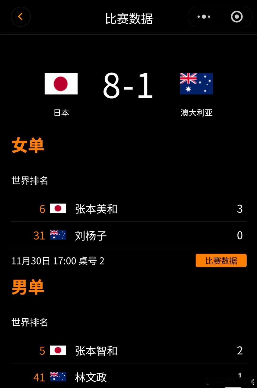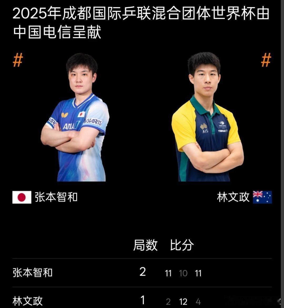 日本8比1澳大利亚2025成都国际乒联混合团体世界杯小组赛,日本队8-1澳大利亚队。第一盘:户上隼辅/早田希娜3-0卢伟/佳木娃【11-7,11-7,12-10】第二盘:张本美和3-0刘杨子【12-10,11-2,11-1】第三盘:张本智和2-1林文政【11-2,10-12,11-4】
