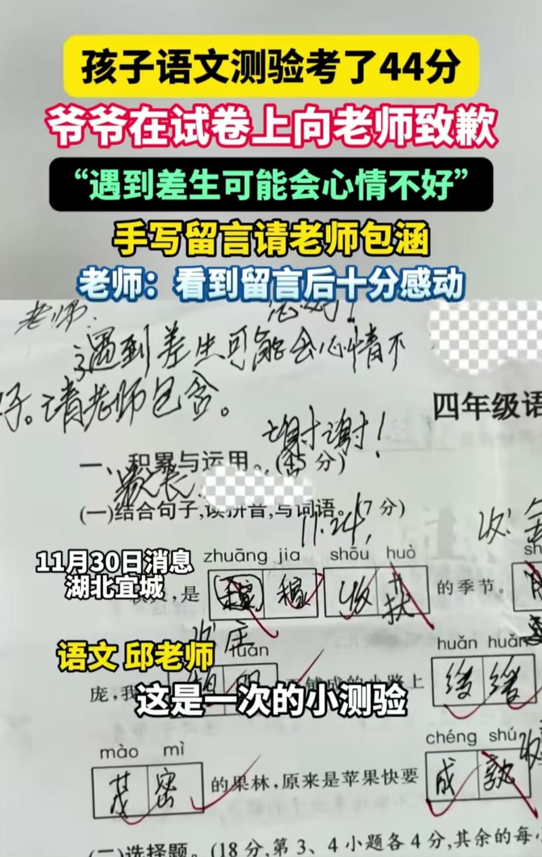 一张考了44分的语文卷,没看到家长的责骂,倒见着爷爷歪歪扭扭的留言:“遇到差生可能会心情不好,请老师包涵”。 这是湖北宜城那个留守儿童的试卷,爸妈在外打工,爷爷带着他,成绩跟不上,还有点小调皮。老人没怪孩子不争气,没怨老师不尽心,只悄悄把“给别人添麻烦”的不安,写在了卷角。 这哪是道歉啊,是老人把孙儿的小缺点,都裹成了自己的小心翼翼。邱老师看到这行字时当场红了眼,她说:“从没觉得这是麻烦,只心疼老人的懂事,更想多花点时间帮这孩子赶上来。” 教育从来不是比谁考得高,是有人懂你的难,愿意陪你慢慢走。你看,这行软乎乎的字,早把“差生”的标签,换成了人心底最暖的光。