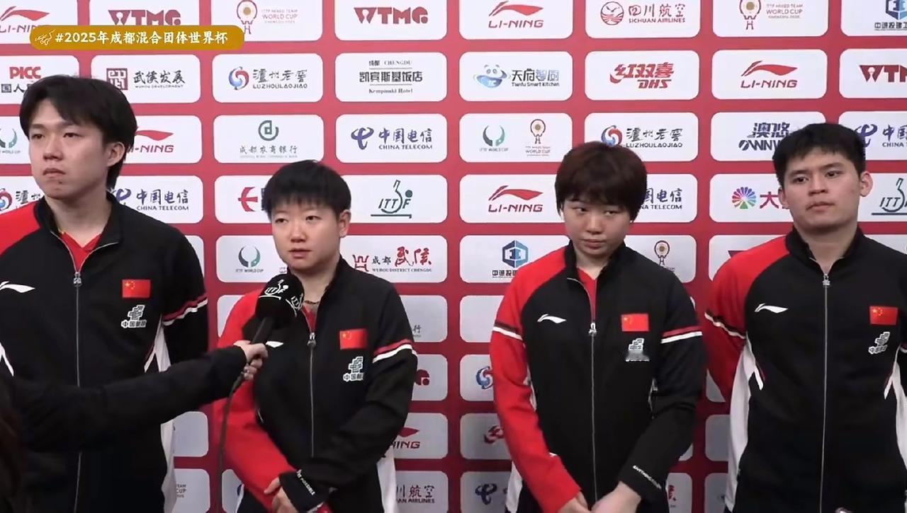 混团世界杯首胜,记者采访, 王楚钦说很紧张, 蒯曼说很紧张,石头也说非常紧张,唯独孙颖莎没说紧张, 记者问:这场比赛看似3:0,其实有两局也是打到了关键分,你俩在场上时咋沟通的? 孙颖莎:我觉得还是一分一分的想办法追吧! 其实从第一局上来,比赛的氛围,还有整体的感觉,可能还是有点不是特别习惯和熟悉,不过第一局能赢下比赛,感觉很不错,后面两局我俩的节奏还是非常流畅的,最后能赢下比赛,感觉很不错! 接着又夸了一下香港的俩对手,早在巴黎周期就打过很多次了,而且他们的右手搭档实力还是非常强的! 看看莎莎这格局,难怪说不紧张,思路太清晰了!