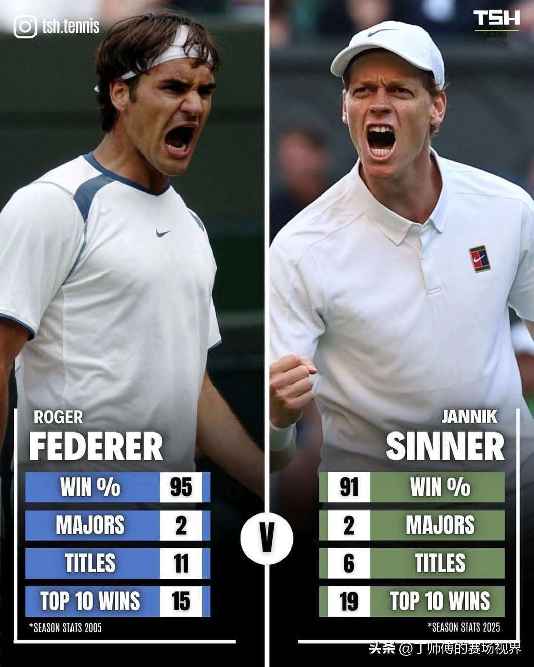 辛纳在2025年的表现堪称惊艳,唯一能与之媲美的只有2005赛季的巅峰费德勒: 胜率:辛纳91%,费德勒95% 大满贯:辛纳2个,费德勒2个 冠军头衔:辛纳6个,费德勒11个 对前十球手胜场:辛纳19场,费德勒15场 费德勒虽然赢得更多冠军头衔,但辛纳缺席了三个月的比赛,复出后依旧是另一个层次的球手,对排名前十球手的胜场多达19场,我认为他才刚刚开始,还远不到他的巅峰。