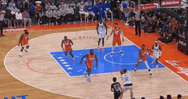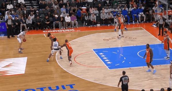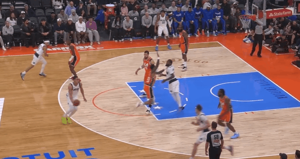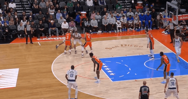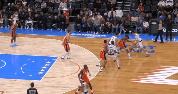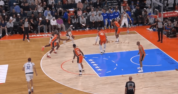 新秀观察:状元的生涯之夜,弗拉格对阵快船35+8状元弗拉格在今天对阵快船的比赛中,打出了自己生涯迄今为止最佳的一场比赛——投篮22中13,砍下35分8篮板2助攻。此役过后弗拉格也成为了NBA史上第二年轻砍下30+的球员(仅次于詹姆斯),以及最年轻的砍下35+的球员,单场35分也打破了VJ此前创下的本届新秀单场得分纪录(34分)。图1“后挖”或者说持球手异侧脚的“挖步”启动左路突破——这个回合科林斯的转髋、后续交叉步跟防还算利索,没有失去身位,但很快暴露出了其防守端的一个缺陷,也就是此前球探报告中说过的单防硬度不足——弗拉格行进间的急停沉肩、支肘对抗直接撞飞了科林斯,获得投篮空间衔接“脚步重置”后立即拔起中投。图2与鲍威尔的边路挡拆配合,哈登采取“提前挤过”诱导弗拉格走掩护墙反方向并将球往边线驱赶,弗拉格“将计就计”:佯装交叉步启动左路突破,随后迅速背后运球拉回,衔接和鲍威尔的挡拆配合挂住哈登后行进至罚球线,中投稳稳命中。图3衔接和鲍威尔的手递手配合,借助掩护延阻伦纳德将伦纳德卡在身后,随后衔接行进间的左手炸球合球跳步急停中投转抛投,打击祖巴茨的沉退。图4接球晃飞扑防的伦纳德后,面对执行“剥离换防”的科林斯变向换到左手后沉肩主动寻求对抗,对抗后立即衔接非惯用手勾手打进。图5弱侧接应突破,“转髋加速”启动左路突破没能摆脱科林斯,迎着防守起跳终结不进,随后迅速二次起跳将球补进。图6无球设置挡拆起手点名保罗,肘区背身要位后转面框交叉步走左路突破被保罗的对抗和桑德斯的强侧刷卡逼停,随后立即衔接背转身翻身后仰跳投终结。图7借助克里斯蒂的“幽灵掩护”启动右路突破攻击哈登前脚,摆脱后面对伦纳德的协防刷卡“大回环”合球起步后直杀篮下,双脚起跳滞空左手挑篮躲避祖巴茨护框。图8借助克里斯蒂的无球掩护换走邓恩,随后佯装走左路突破,沉肩对抗后迅速衔接背后运球变到右路,面对邓恩的夹击“大回环”保护住球后找到底角的马绍尔。图9早期进攻持球操刀“Double Drag”佯装走掩护墙一侧,实则直接“拒绝掩护”变向走右路突破,鲍威尔迅速翻转掩护方向挂住追防的哈登。弗拉格挡拆行进间面对沉退的祖巴茨,在伦纳德上前刷卡的一瞬间立即变向走左路突破,攻击祖巴茨横移之后直接起跳隔扣。图10借助鲍威尔的掩护延阻巴图姆后,挡拆行进间炸球横撤步后仰中投致敬杜兰特(图11)、打击祖巴茨。弗拉格隔扣祖巴茨弗拉格35分生涯新高独行侠战胜快船