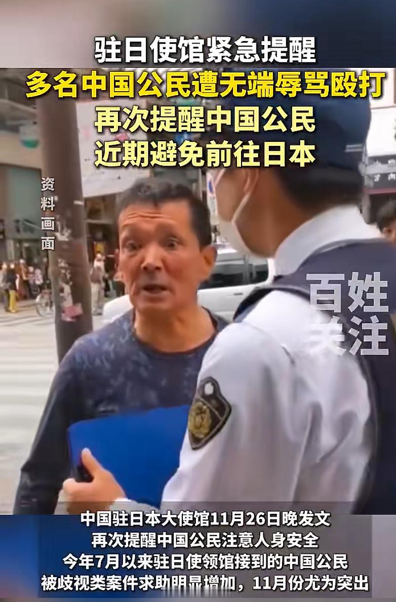近日,多名旅日中国公民报告遭到无端辱骂殴打并受伤。有关案件发生后,驻日本大使馆和各总领馆第一时间表达慰问并提供协助,向日方提出交涉,要求尽快破案,严惩凶手,切实保护中国公民合法权益。目前多起案件仍未侦破,施暴者尚未受到法律制裁。日本