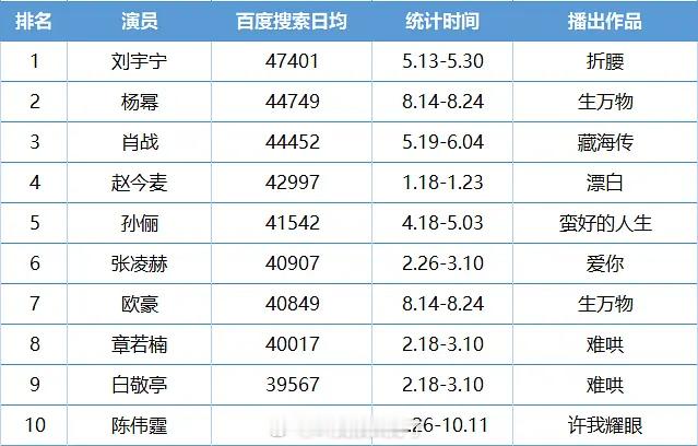 今年剧播期的演员百指TOP10,符合体感吗?刘宇宁《折腰》、杨幂《生万物》、肖战《藏海传》、赵今麦《漂白》、孙俪《蛮好的人生》、张凌赫《爱你》、欧豪《生万物》、章若楠、白敬亭《难哄》、陈伟霆《许我耀眼》
