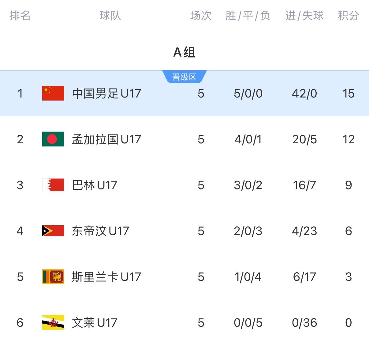 U17亚预赛积分榜:国少积15分小组第一晋级明年U17亚洲杯,5战全胜狂轰42球0失球 11月30日 U17亚预赛最后一轮 U16国足4-0战胜孟加拉国, 积分榜上:5轮全胜积15分领跑积分榜,成功晋级明年U17亚洲杯。狂轰42球0失球, 2026年沙特U17亚洲杯将在2026年5月7日-24日举行