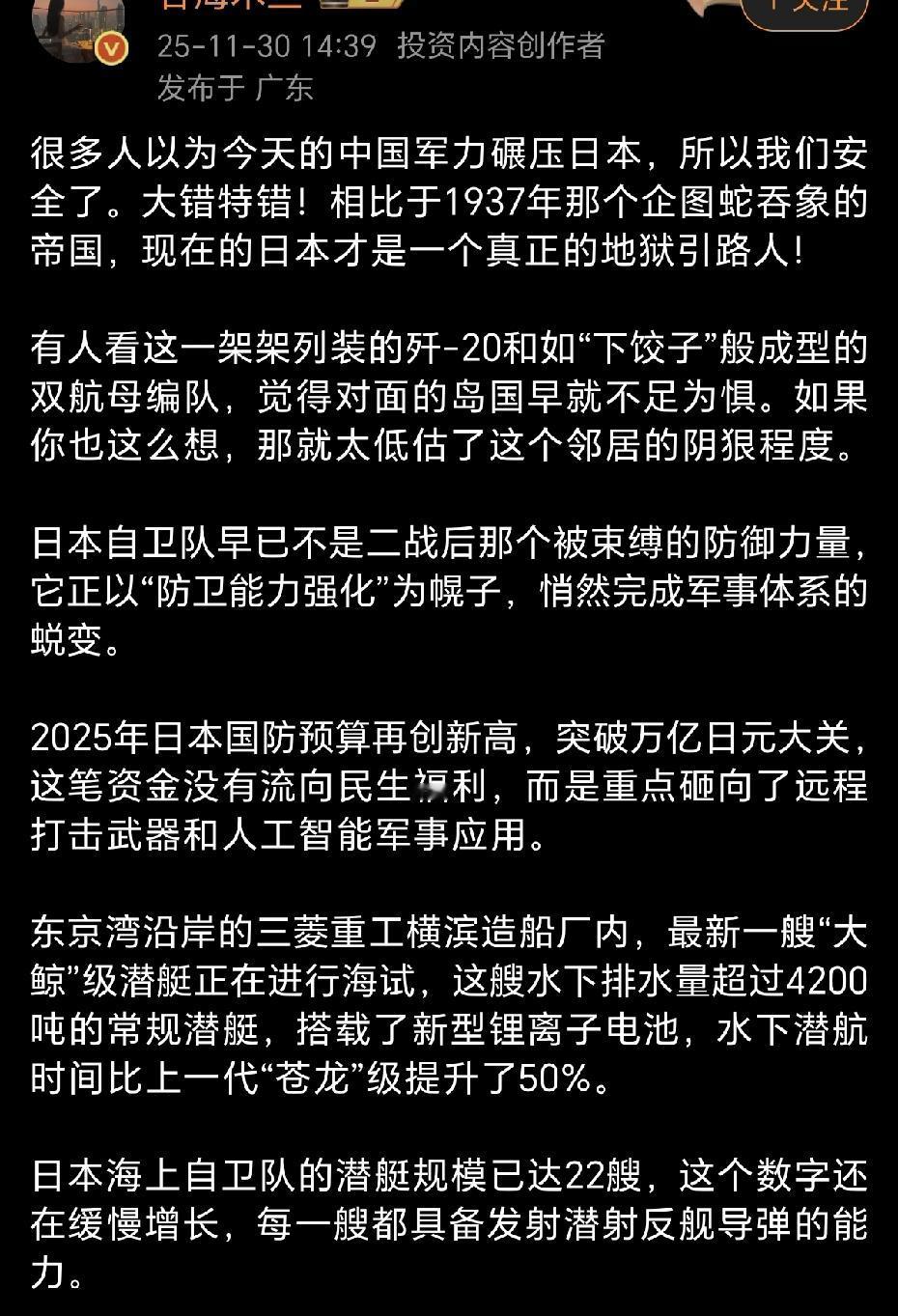 我就搞不明白了,既然我们不能低估日本人的阴险,那为什么我们还要等呢?等日本人造出核弹吗? 既然我们知道日本人正在大力的武装自己,为什么我们还要等呢?等日本人全面军事化了之后再打吗? 当年日本人打我们的时候,他有没有等到我们发展起来再打我们呢? 微博有些大V,看他们说话好像都是在为中国好,但实际上每句话都经不起任何的推敲。