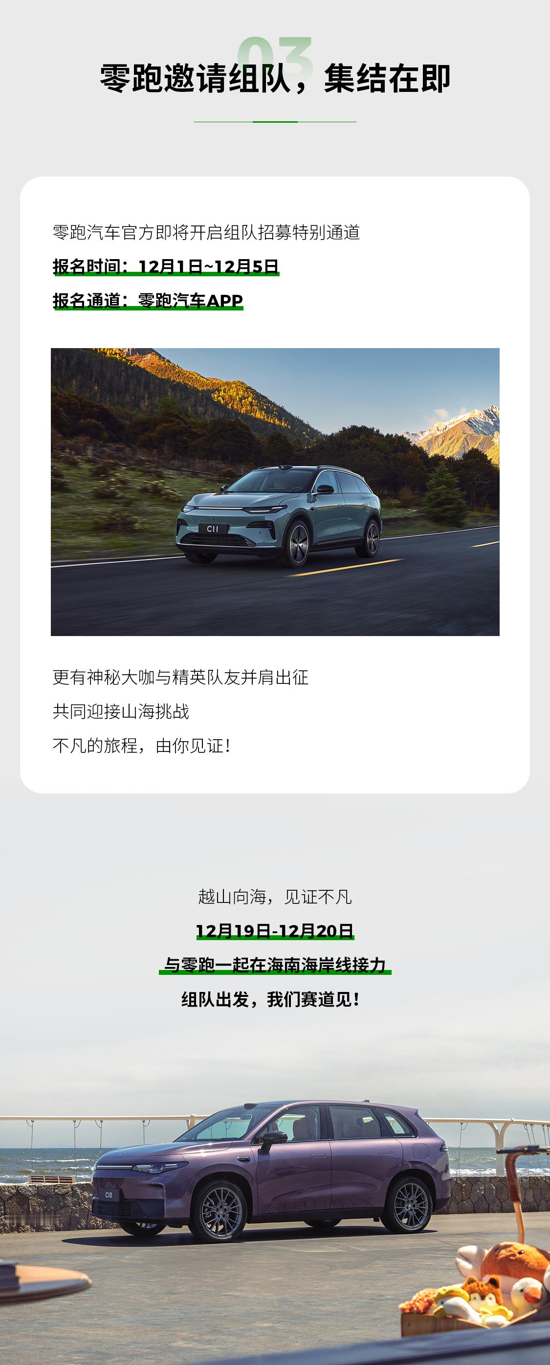 📣集结!零跑邀你组队赴山海🏃2025越山向海人车接力中国赛😆零跑汽车官方组队通道即将开启👀12.1-12.5 零跑APP限时报名🚗与志同道合的跑者,驾乘零跑C系座驾共赴海南海岸线接力✊期待与你,在赛道上并肩接力!零跑汽车零跑C16零跑C11零跑C10