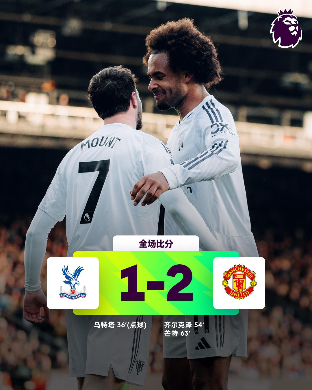 全场比分丨水晶宫 1-2 曼联 ⚽第33分钟,马特塔主罚点球命中但二次触球犯规;第36分钟,马特塔重新主罚命中 ⚽第54分钟,齐尔克泽禁区左侧小角度抽射破门 ⚽第63分钟,B费任意球一拨,芒特低射破门