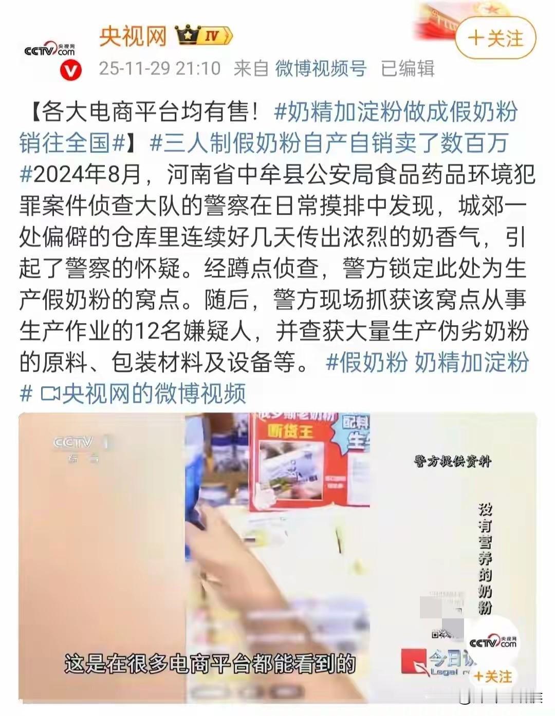 成本4块,却被卖到了88元一罐,销售额达到650余万,假奶粉重出江湖?看了央视报道,不禁后背发凉,这假奶粉几乎不含奶,各大平台还均有售。 明明只有植脂末、麦芽糊精和固体饮料三种原料成份,却在河南一家小作坊中摇身一变成了国外进口奶粉。 要不是当地民警在日常摸排中发现,这样的罪行还指不定要持续多久。 通过调查发现,这个作坊生产的奶粉,当时居然在各大平台都有销售,其中不乏一些卖货主播直接这样叫卖:喝点好奶粉吧,咱们手上这款奶粉是纯牛奶…… 如今,再回看看这些主播有多荒唐,你们良心不会痛吗?你们选品的时候有没有去考察一下,在出售的这650万销售额中,你们居然也出一份力,可笑!可悲! 再来看看这是什么样的小作坊,在三个大的洗澡盘里直接搅拌、过秤、分装,整个过程没有一点卫生保障(见下图)。 民警表示,这些人以假乱真挺有水平,奶粉如果光从外观根本判断不出来了,其中加了奶精,闻起来还很香,而这些奶粉经过化验,各项指标均没有达到国家标准。 说白了就是:假的不能再假了! 如今,三名主犯已经被判刑,其他涉案人员也在被追溯中。 这起事件,也再次给我们敲响一记警钟。 1、别把“无营养”当成“无害”! 在有些老板眼里,只要不使人中毒,就没有“大错”,但他们忘了这是食品,何况假奶粉销售的对象还是婴儿和老人,即使这些伤害短时间内不是“立竿见影”,但长此以往,这就是在慢性摧残啊! 2、赚钱可以,但必须走正道,必须有最基本的良心。 成本2-4元,却卖到了30-88元不等,这利润高得离谱!在这些超额的利润面前,某些人的良心良知已经被彻底碾压。 3、制造者固然可恨,但销售却在网络,在方便大众购物的同时,如何去堵住假货,各大平台需要多一份用心。 4、最后一道防线,在消费者这里。 不能占便宜,不能被“低价清仓、进口食品”冲昏了头脑。 食品安全,任重而道远!