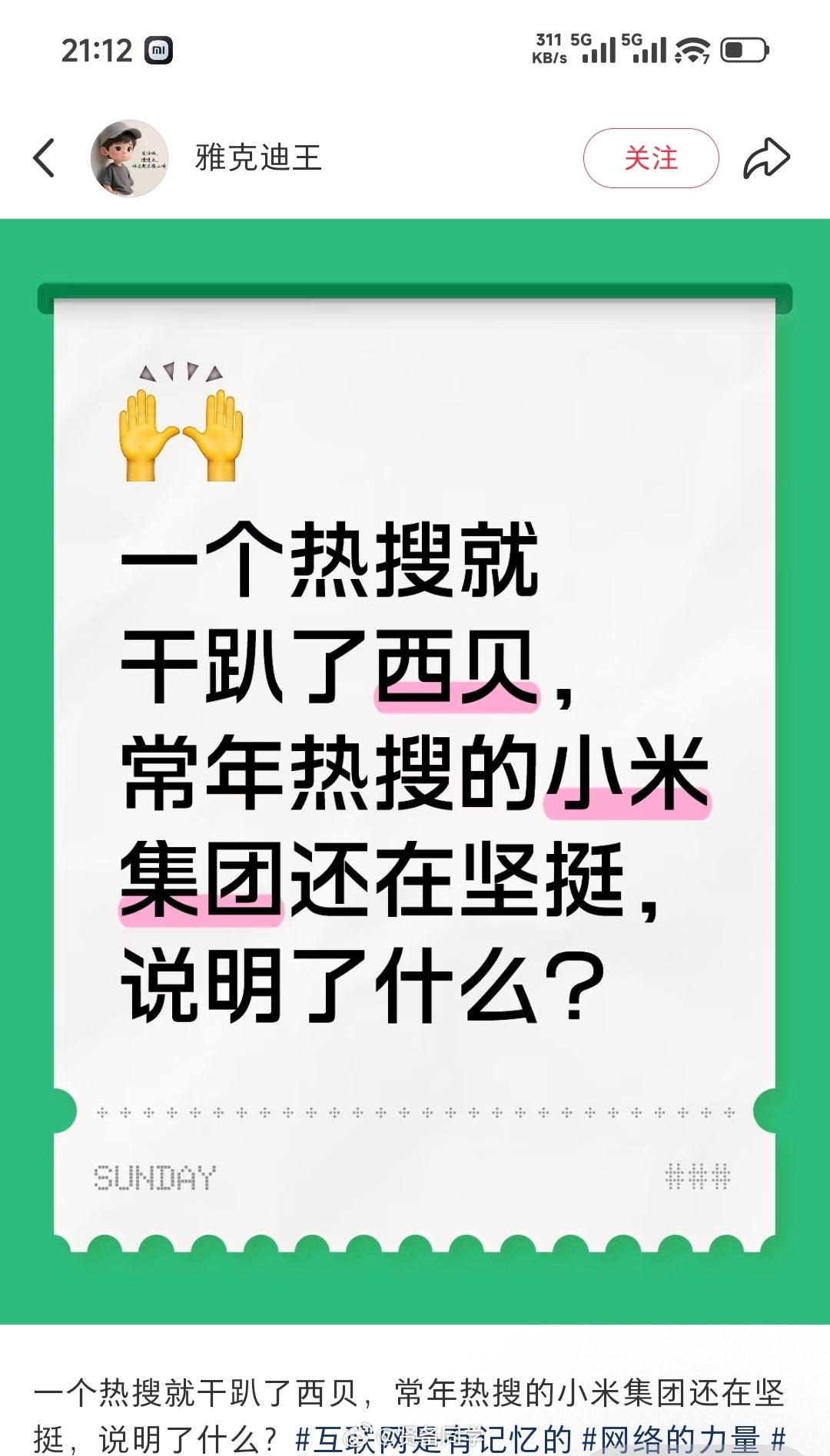 “一个热搜就干趴了西贝,常年热搜的小米集团还在坚挺,说明了什么?”传奇耐黑王!