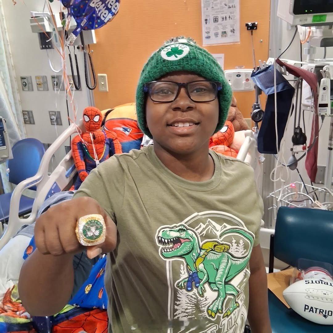 昨天,塔图姆和萨姆-豪泽现身波士顿儿童医院,为一位小球迷送上了惊喜,还带来了一枚总冠军戒指让他试戴