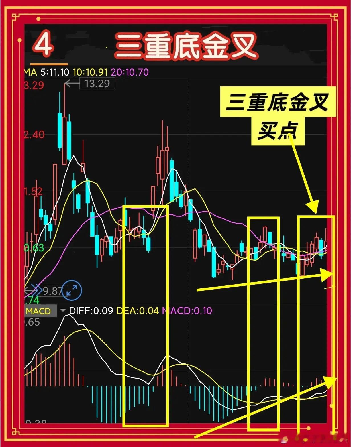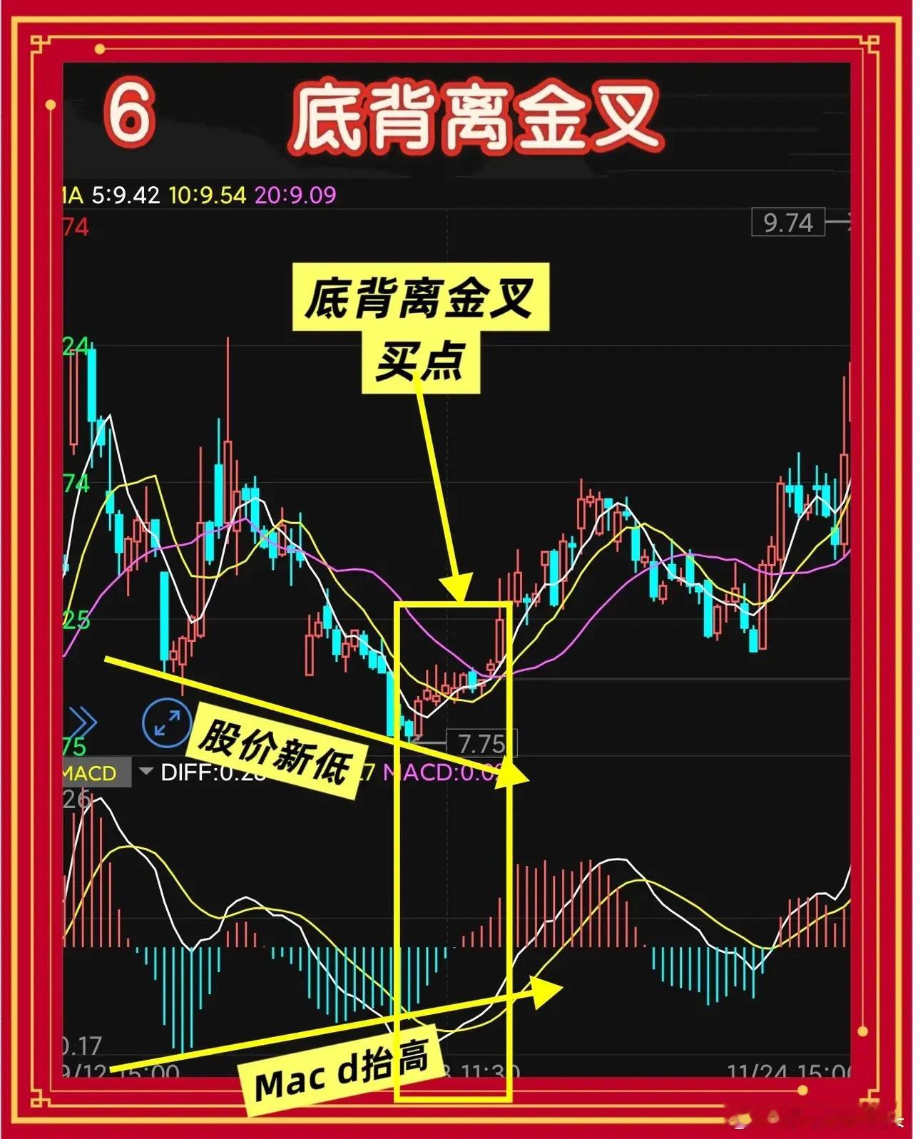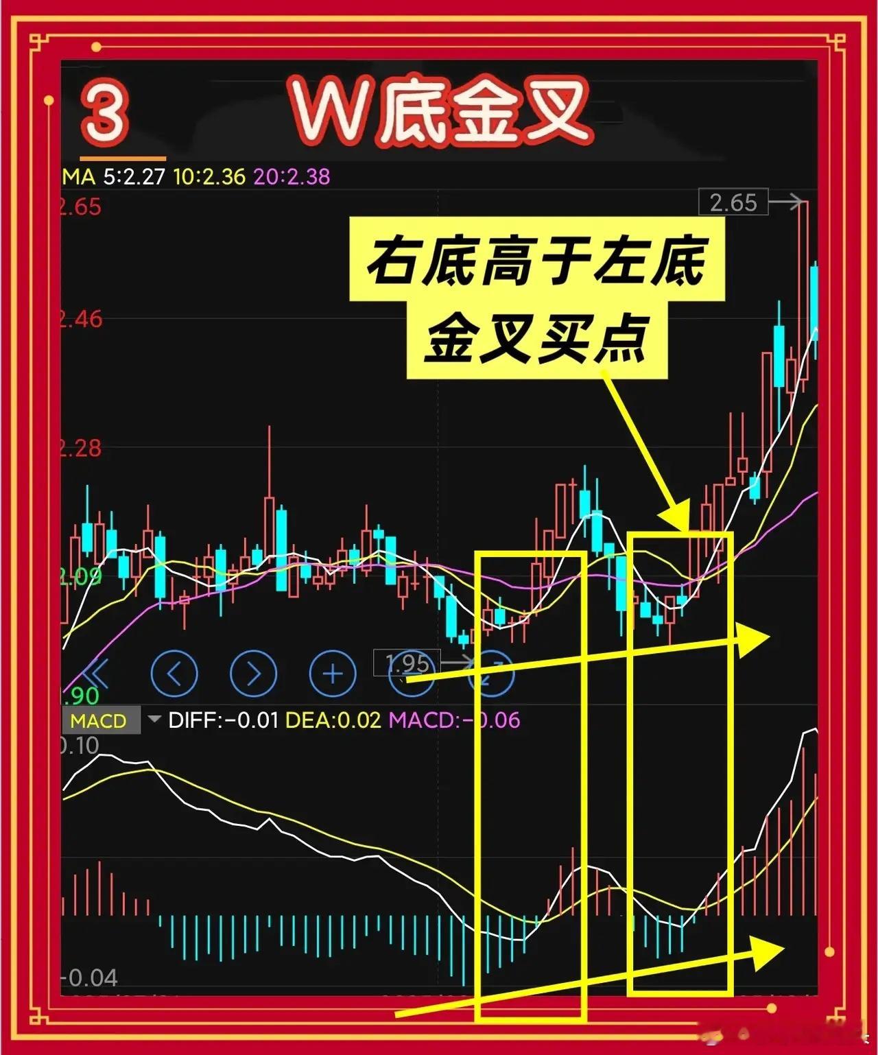 MACD六大黄金买点:从0轴金叉到三重底,精准锁定起爆点第一条:0轴上二次金叉当白黄线于0轴上方先形成金叉后又转为死叉,但未跌破0轴,数日后再次形成金叉,这可视为主力洗盘结束的信号。倘若第一次金叉后的红柱较短促,而第二波红柱显著放大,这便是加仓的信号,可积极介入。第二条:低位平移后金叉在0轴下方,白线停止下探,转而横向水平移动,然而股价仍惯性下滑,二者出现背离。一旦白线结束平移,向上抬头与黄线形成金叉,就宣告阶段底部确立,此时是最佳抄底时机。第三条:W底金叉在下跌途中,白线先下跌后上扬,出现第一次金叉;随后再次死叉回落,但未创新低,接着再次拐头向上形成第二次金叉,其轨迹呈现W状。当右底高于左底且量能温和放大时,反弹的概率极高,可果断买入。第四条:三重底金叉若白线在相近价位附近三次下探均获得支撑,形成“VVV”三重底,并且每次探底后都出现金叉,那么第三次金叉即为终极确认信号。此时抛压已尽,多头蓄势待发,应顺势跟进。第五条:头肩底金叉在0轴下方,白线轨迹构成倒置头肩形态:左肩、头部、右肩依次展现。在右肩形成之时,白黄线再次形成金叉,同时伴随成交量放大,这标志着底部反转完成,是趋势性买点,可重仓参与。第六条:底背离金叉股价不断创新低,而白黄线却逐步上升,二者方向持续背离。当低位反复出现两到三次背离后,最终形成金叉,这意味着空头力量衰竭,短期反弹即将来临,可逢低布局。以上六种形态均为MACD经典买入形态,每一种都需在0轴上下结合量价、趋势、位置进行综合验证,切不可仅凭单一信号就孤注一掷。熟练掌握后,可在日线、60分钟甚至30分钟图中快速锁定起爆点,使建仓成本贴近主力成本区。大家点赞,评论,加关注就是对莎莎最大的支持