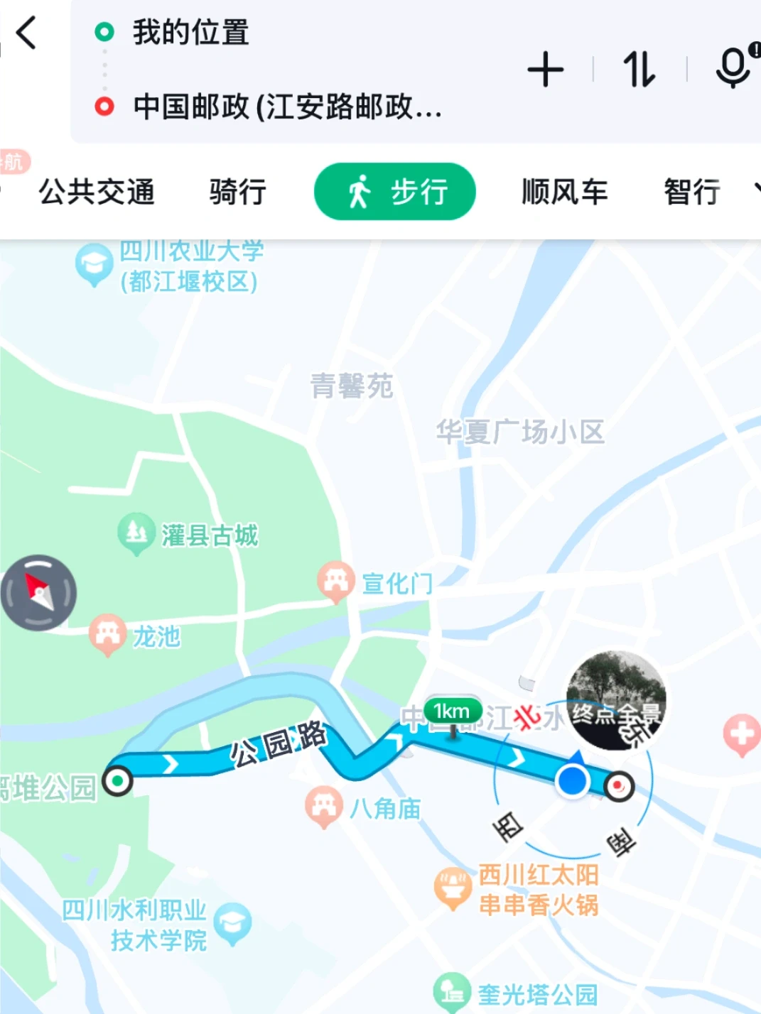 我是上午青城山下午都江堰,所以我就找了距离都江堰最近的邮局,地图搜「江安路邮政支行」,步行过去约1.4公里。寄完可以直接去「离堆公园」高铁站坐车回成都,步行也1公里多点~(考验友情时刻😌