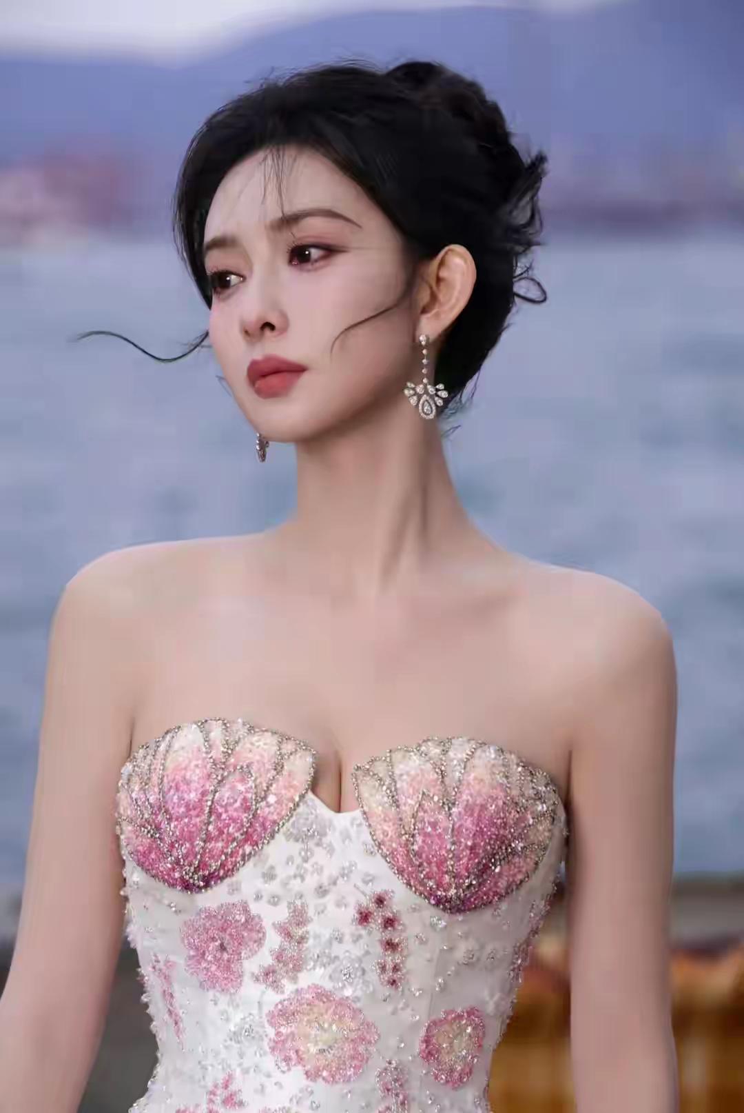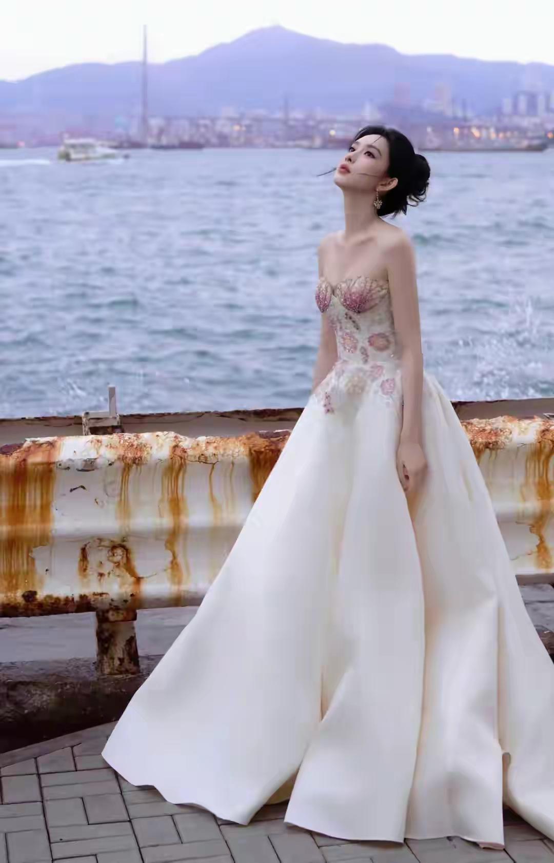 海浪漫过堤岸的黄昏,孟子义裹着一身“贝壳裙”站在风里——抹胸上粉白渐变的贝壳纹路缀满碎钻,像刚从海浪里捞出来的月光,碎发被风掀起时,耳坠的银链晃成星子。 这裙子是真敢做:胸口是半开的贝壳轮廓,裙身铺着雾粉花瓣刺绣,连褶皱里都藏着细闪,偏她撑得起这娇俏,肩颈线条像被海风磨过的玉,抬眼时,红唇又压得住甜腻。 内娱穿礼服总逃不过“贵气”,她偏把高定穿成了童话里的人鱼,连背景的蓝雾都成了她的裙摆。