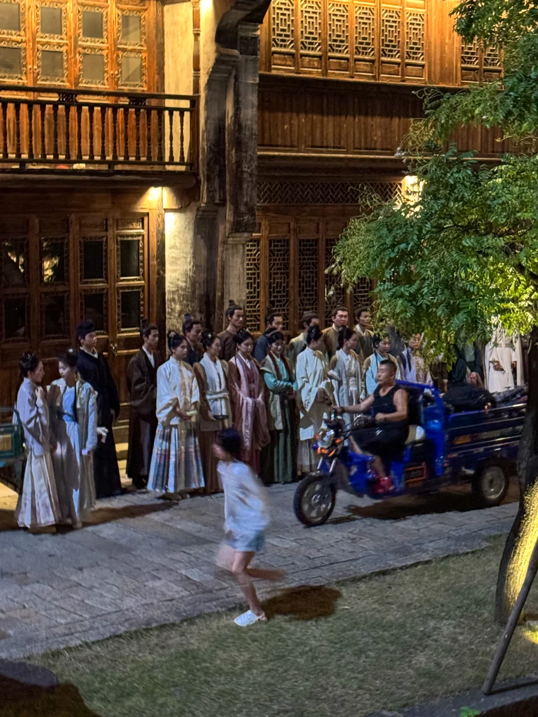 不愧是明星含量最多的古镇。 据说是《表妹万福》剧组,路过时正在做拍摄前准备,图1群演们点名集合~ 图2有点穿越哈哈,器材组正在送装备。
