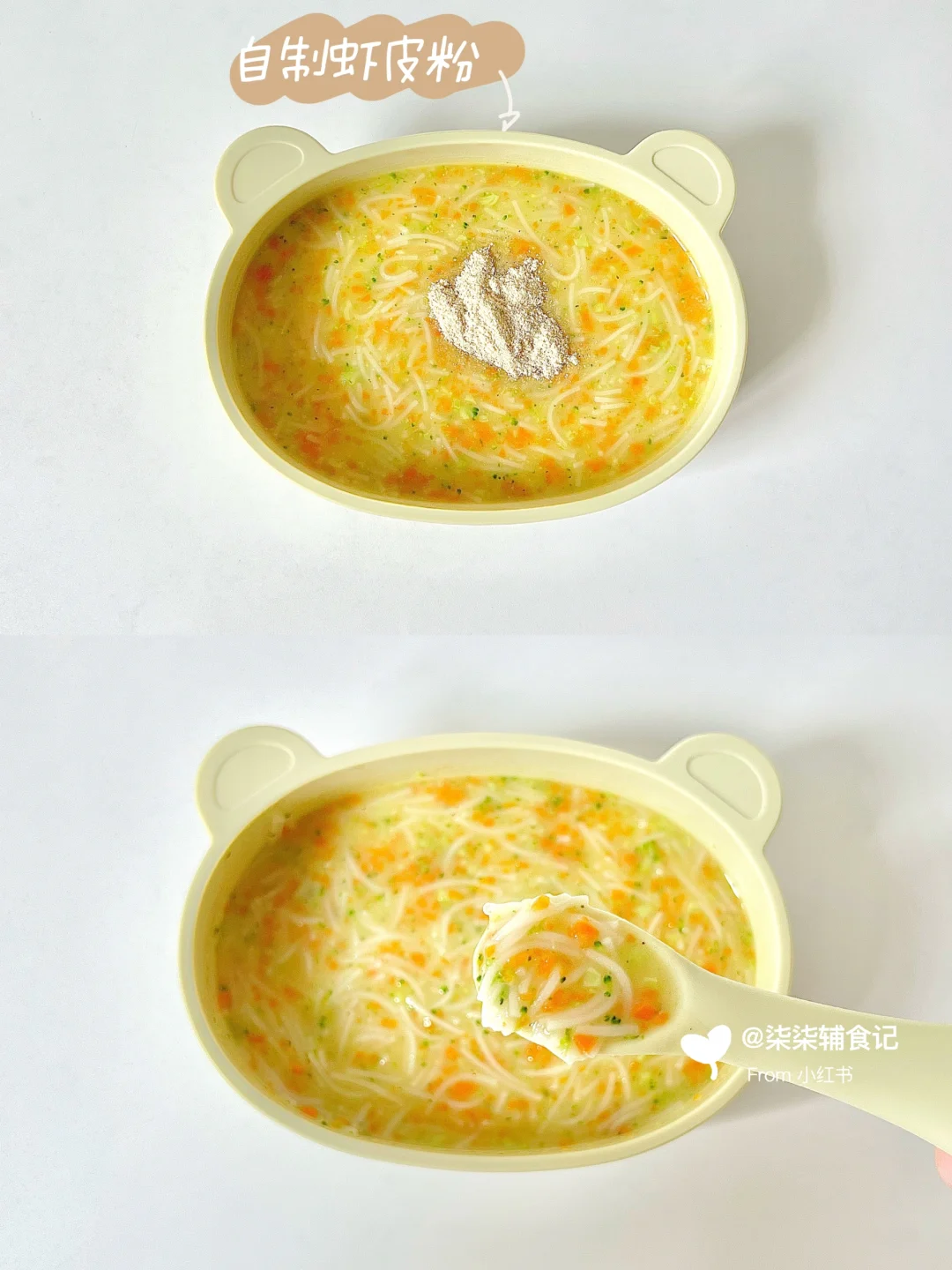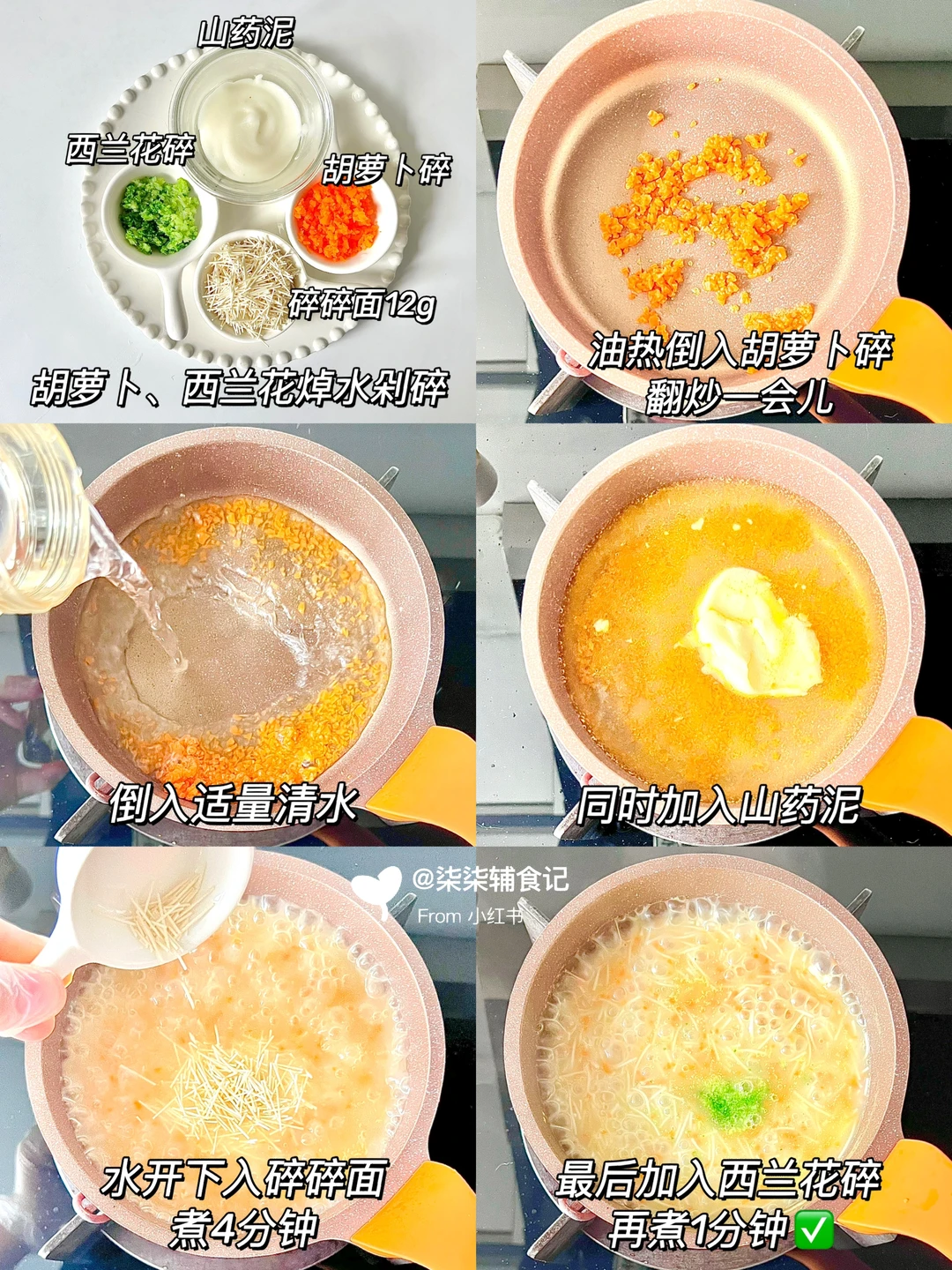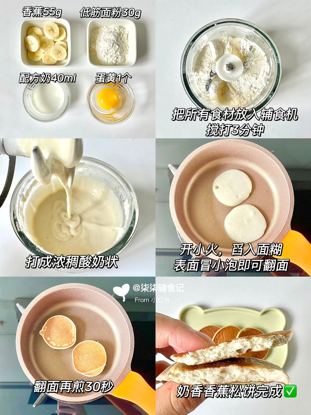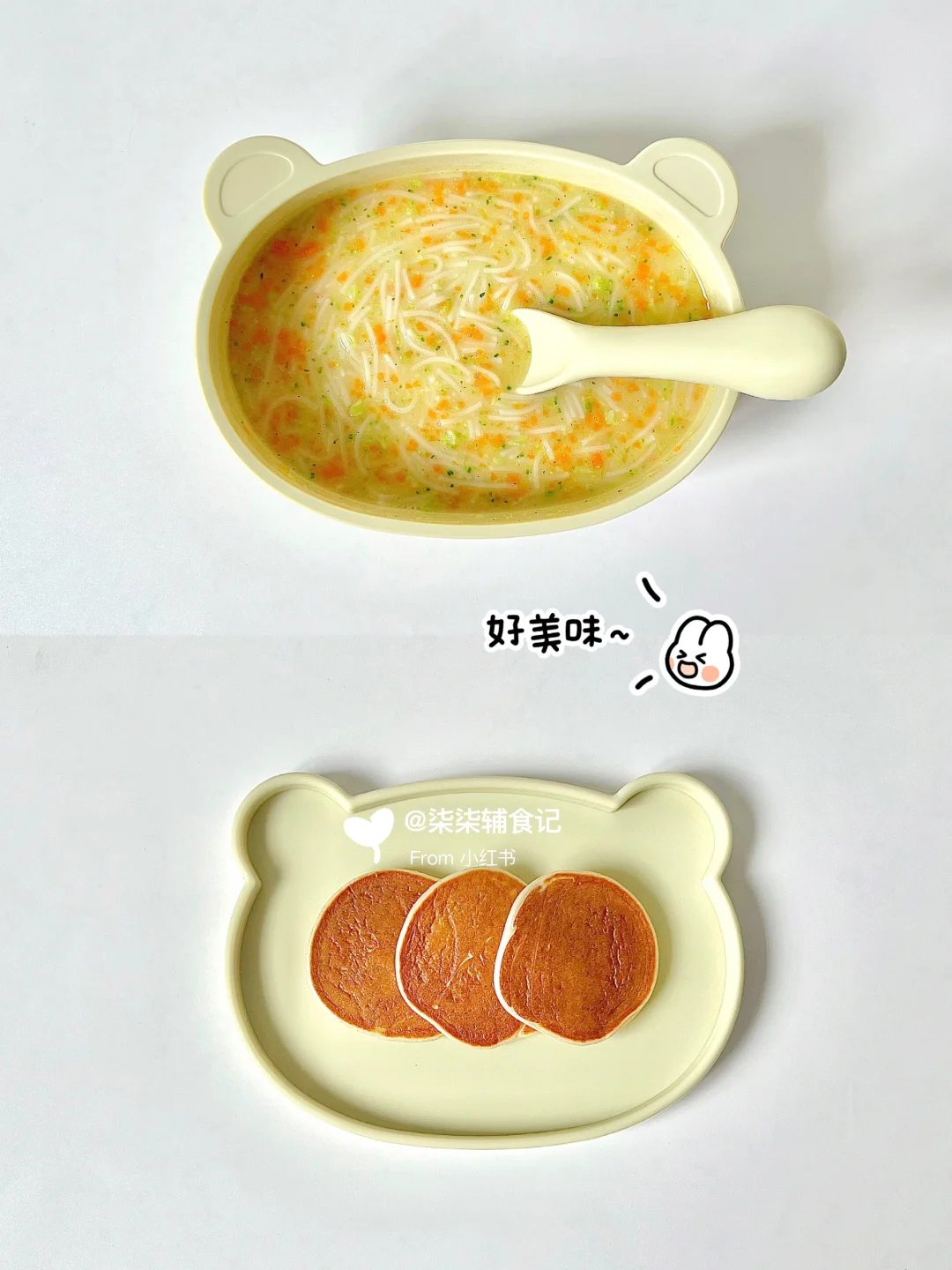 📝:碎碎面12g➕适量清水➕胡萝卜碎➕山药泥➕西兰花碎➕奶香香蕉松饼