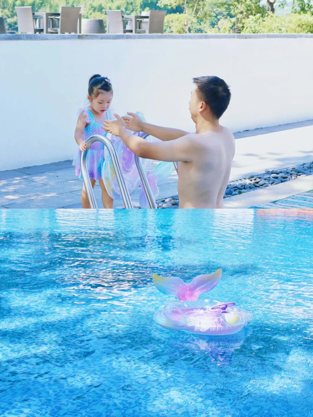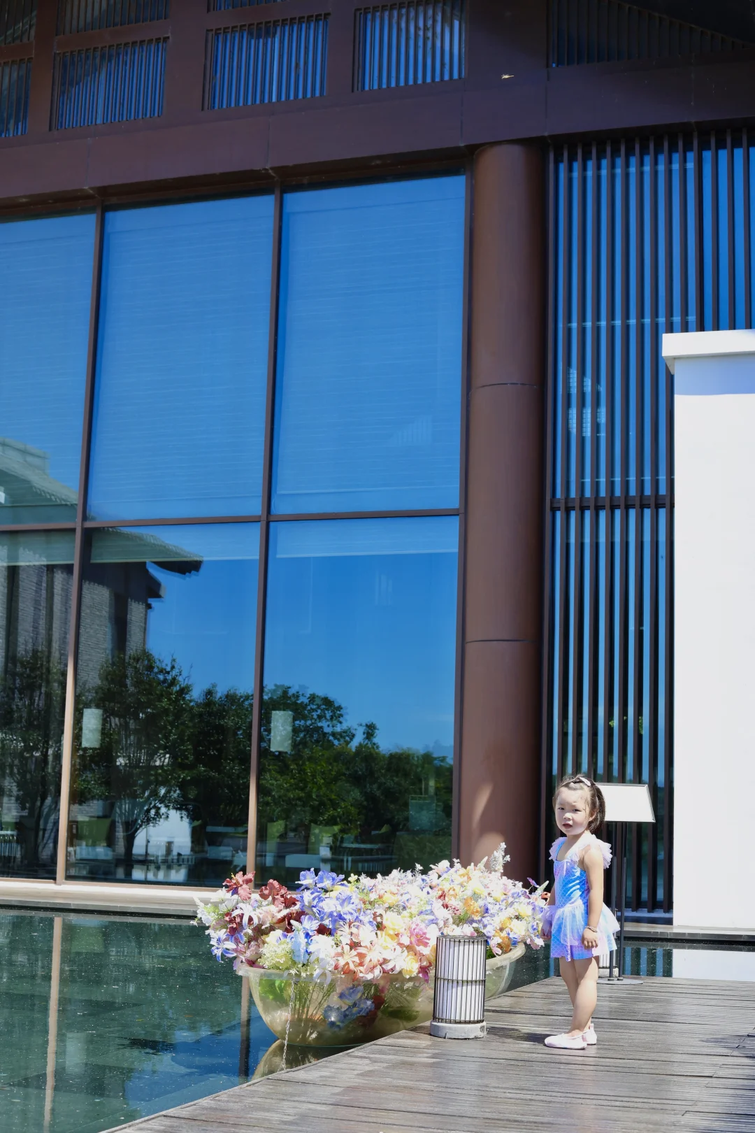 用完餐后,可以去园子里散步,湖景和园景都很不错,随便拍都很出片。湖边🈶无边泳池,水很干净、有80厘米高,从前都不敢下水的潼宝都嚷嚷着要下水去玩,对幼儿很友好了