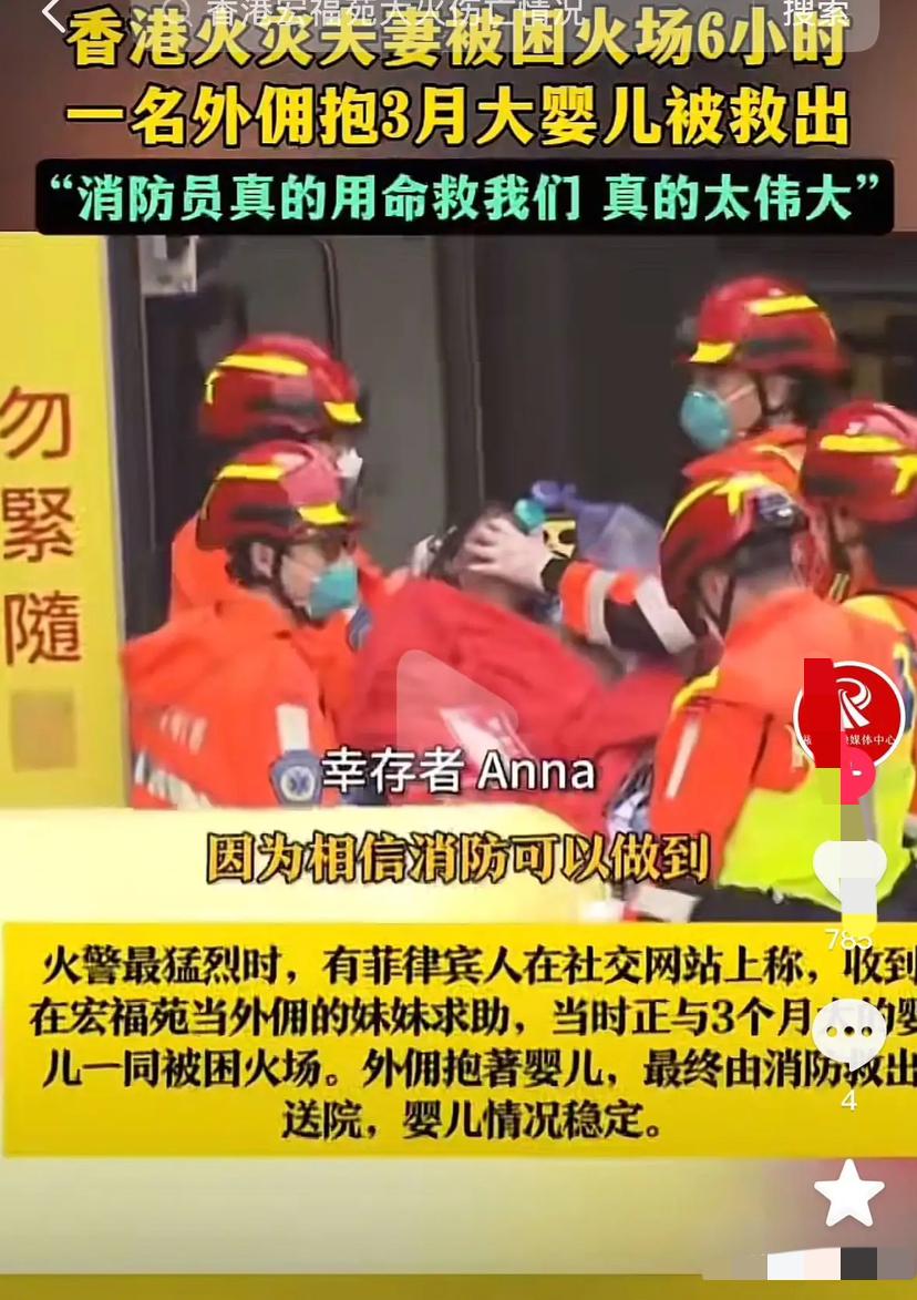 人间有真情,香港这名菲佣火了!她和雇主家三个月大的女婴一同困在火场,她不仅没有选择独自逃生,反而将最大的生还机会留给了孩子。最终,她们成功等到了救援。 这名菲佣来到香港工作的时间还不长,那天,就她和宝宝两个人在家里。或许是没能联系上雇主,她便把求救视频发给了远在菲律宾的姐姐。随后,姐姐通过网络求助。 这位让全网动容的菲佣名叫艾卡雷兹,她踏上香港的土地还不足一周,说到底只是个为了生计远赴他乡的普通打工人。老家的日子过得清贫,父亲靠着捕鱼维持家用,她背井离乡来做佣工,不过是想多挣点钱帮衬家里,没曾想刚上岗没多久,就遭遇了这场灭顶之灾。火灾发生时,外墙的发泡胶和竹棚被烈火吞噬,火势借着风力疯狂蔓延,玻璃接连炸裂,滚滚黑烟像张密不透风的网,瞬间灌满了整个屋子,高温炙烤着每一寸空间,连呼吸都成了奢侈的事。 屋里只有她和三个月大的宝宝,脆弱的婴儿根本经不住浓烟侵袭,艾卡雷兹没有半分犹豫,立刻找来了湿毯子紧紧裹住孩子,自己则用身体挡在外侧,硬生生扛下了扑面而来的热浪和烟雾。被困的数个小时里,她始终保持着蜷缩的姿势,双臂死死环抱着怀中的小生命,哪怕浓烟呛得她喘不过气,哪怕身体被高温灼得生疼,她的手也从来没有松开过。绝望之际,她颤抖着给菲律宾的姐姐发去语音求救,声音里满是难以抑制的啜泣:“我觉得很虚弱,根本无法呼吸。” 可即便自己已经濒临极限,她的注意力始终放在宝宝身上,轻声哄着怀里的孩子,生怕惊吓到这个小小的生命。 远在菲律宾的姐姐收到讯息后,急得团团转,立刻在社交平台发布求助视频,哭喊着希望有人能救救被困火场的妹妹。这条求助信息很快在网络上扩散开来,香港民众和外佣社群纷纷揪心关注,大家一边为她们祈祷平安,一边帮忙转发求助,盼着救援人员能尽快找到她们。而火场里的艾卡雷兹,靠着一股执念撑着,她心里只有一个念头:一定要护住宝宝,等着救援到来。 当消防人员破门而入时,眼前的一幕让所有人动容——艾卡雷兹依旧保持着紧抱婴儿的姿势,哪怕已经快支撑不住,还是下意识地把孩子护在最安全的怀里。万幸的是,宝宝被保护得很好,获救后身体状况稳定,可艾卡雷兹却因为吸入大量浓烟、身体多处被灼伤,陷入了危急状态,被紧急送往医院后,直接转入深切治疗部接受插管治疗,至今仍在生死线上挣扎。 她的英勇事迹传开后,无数网友自发为她祈福,有人感叹“这哪里是佣工,分明是孩子的守护神”,有人直言“她用行动打破了雇佣关系的偏见,这份善良无关身份”。菲律宾政府也密切关注着她的病情,证实她就是此次火灾中情况危殆的菲籍佣工,全力跟进后续救治事宜。大家在心疼艾卡雷兹的同时,也不禁想到,香港的外籍佣工群体常年默默付出,承担着家务和照顾老幼的重任,可不少人月薪仅五千港币左右,却在关键时刻展现出了超越雇佣关系的担当。 其实艾卡雷兹和宝宝相处的时间并不长,短短几天的陪伴,她却用生命践行了责任。在生死抉择的瞬间,她本可以选择独自寻找逃生机会,可她偏偏把生的希望留给了毫无血缘关系的孩子,这份勇气和善良,无关职责所在,纯粹是人性深处最动人的光芒。灾难无情,可总有人用行动温暖人心,艾卡雷兹用瘦弱的身躯筑起了一道保护墙,这份跨越国界的真情,值得所有人敬佩。 如今大家最牵挂的,就是艾卡雷兹的病情,盼着她能挺过难关,早日康复。她的故事也提醒着我们,人与人之间的善意从无高低之分,无论身份如何、来自哪里,那份在危难中挺身而出的担当,永远值得被尊重、被铭记。愿这份善良能被温柔以待,也愿艾卡雷兹能战胜病魔,平安归来。 各位读者你们怎么看?欢迎在评论区讨论。