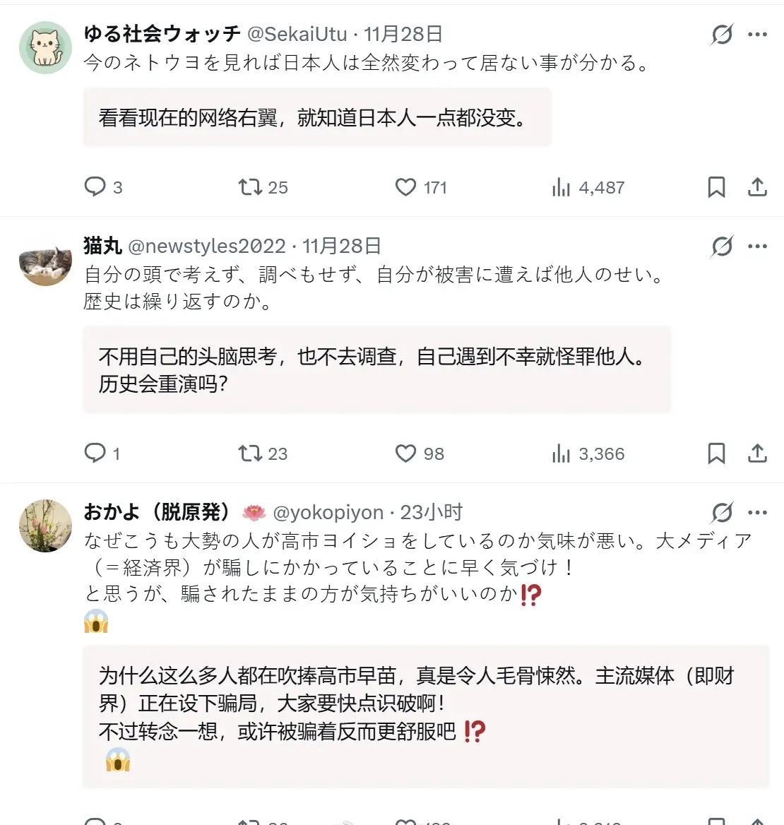 日本人评价,当初二战前就是一群日本人将迟迟不敢向美国宣战的东条英机称为“懦夫”,真的开战了又欢呼“万岁”,等战败后又摆出“我们是被右翼骗了”的受害者嘴脸,但从目前的日本社会氛围看来,日本人一点都没受到教训,等高市早苗让那些日本人吃了苦头,当初最支持她的那群人,大概率又会说“我们被骗了”,但问题是,二战时期说被骗,还能找“那个时代信息闭塞”的理由,而在知识可科技发达的今天,这样的理由还能让谁信服呢 东条英机当年的犹豫从不是胆小,而是清楚日本与美国在国力上的巨大差距,可当时的日本社会早已被军国主义思想绑上战车,神道教宣扬的“为天皇献身”理念深入骨髓,民众被反复灌输“对外扩张才能彰显国威”的谬论,眼里只剩所谓的民族颜面,压根看不到战争背后的累累白骨。他们骂东条英机懦夫,本质是不满对方没能满足自己的激进幻想,等到珍珠港事件爆发,举国上下陷入狂热欢呼,没人去思考这场战争会让多少家庭破碎,更没人质疑侵略行为本身的罪恶。战败后摇身一变装受害者,不过是日本逃避罪责的惯用伎俩——天皇制度没被实质性批判,裕仁天皇的战争责任被刻意抹去,既然最高统治者都能免责,普通民众自然跟着卸下担子,还靠着广岛、长崎原子弹爆炸的记忆大做文章,把自己塑造成战争的无辜承受者,彻底割裂了自身的加害者身份。 这种逃避式的历史态度压根没随着时间消散,反而在右翼势力的助推下愈发嚣张,高市早苗的崛起就是最直白的证明。这个被视为安倍“政治门生”的右翼政客,打从政起就没藏过自己的野心,早年公然质问首相为何承认侵略战争错误,后来常年参拜靖国神社,甚至否认南京大屠杀、为美化希特勒的书籍作序,一系列操作全是在为军国主义招魂。她能坐上高位,离不开自民党安倍派的全力扶持,更离不开日本社会右倾化的土壤——四成年轻人不知道战败日,七成年轻人从没讨论过二战历史,教科书刻意淡化侵略罪行,只反复强调日本的受害经历,久而久之,不少人对历史的认知只剩模糊的“原子弹创伤”,对先辈的加害行径要么一无所知,要么刻意回避。 那些现在狂热支持高市早苗的人,和二战时追捧战争的民众本质没区别。他们中有人被“强化国防、提升国威”的口号迷惑,觉得激进政策能让日本摆脱困境;有人受历史修正主义影响,真以为日本当年的侵略是“自卫”,如今插手台海是“维护安全”;还有人纯粹抱着投机心态,盼着右翼势力掌权能给自己带来利益。可他们心里未必不清楚,高市早苗的冒险行径正在把日本推向危险边缘,涉台挑衅触碰红线,修宪扩军打破和平框架,这些行为迟早会引发反噬,让日本付出惨痛代价。 可即便如此,他们还是选择盲从,等到真的吃了苦头,大概率会熟练地拿出“被骗了”的借口。只是今时不同往日,二战时信息闭塞,民众被军国主义宣传垄断认知,或许还有几分被动的成分;现在互联网普及,各类历史资料、国际评论随手可查,侵略战争的真相明明白白摆在那里,右翼势力的野心也昭然若揭,再拿“被骗”当托词,不过是自欺欺人。说到底,日本社会真正缺的从来不是了解真相的渠道,而是直面历史的勇气和承担责任的担当,只要这种逃避的心态不改变,类似的闹剧或许还会一次次上演。 各位读者你们怎么看?欢迎在评论区讨论。
