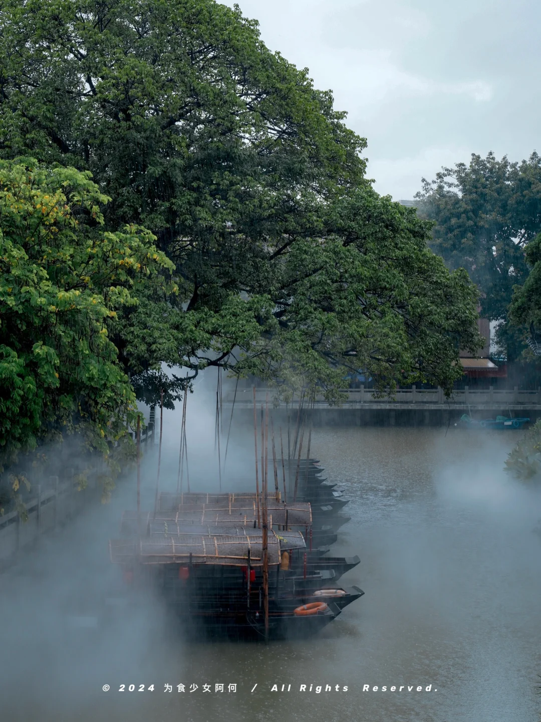 烟雨缭绕的岭南水乡风情街,配合濛濛细雨,很有诗意