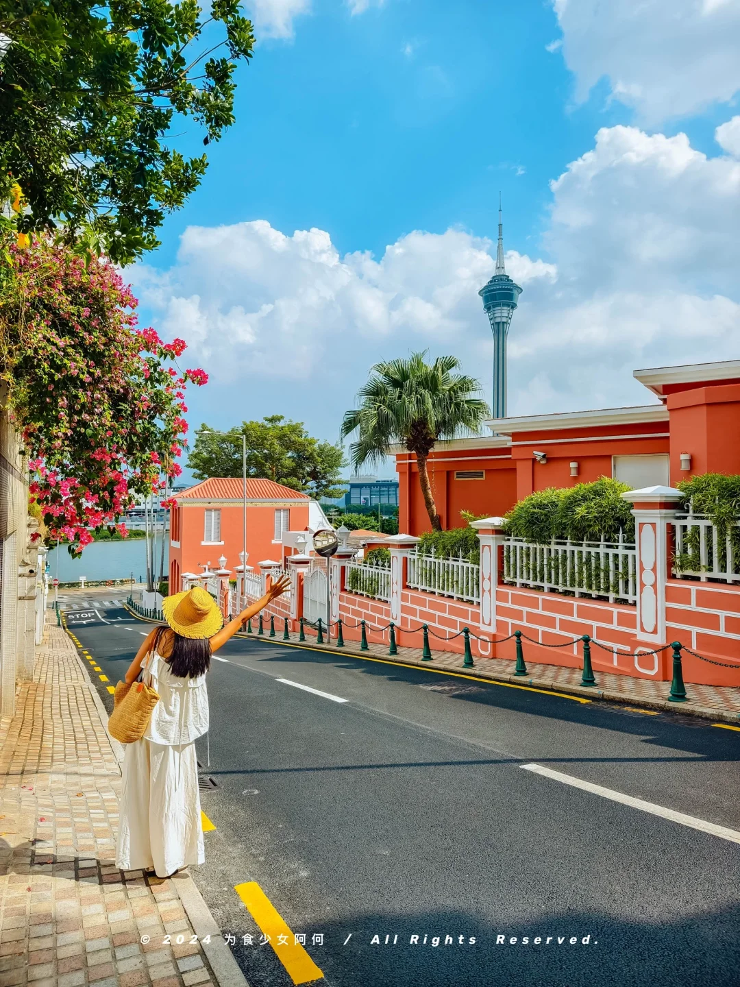 粉色房子、三角梅,还有尽头是通往大海的道路,真的好美