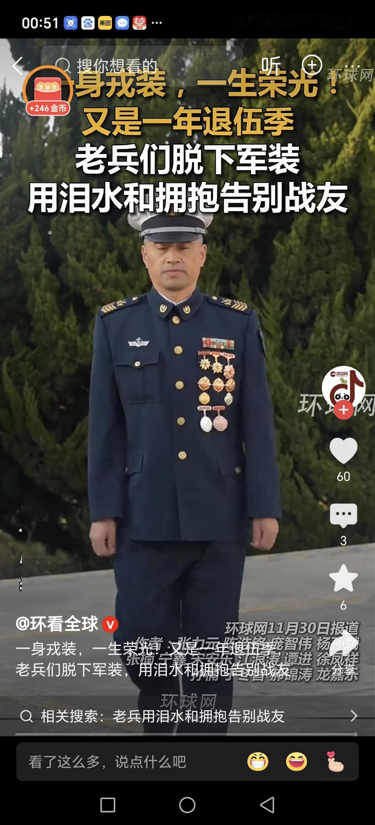 “一身戌装,一生荣光!又是一年退伍季。老兵脱下戌装,用泪水和拥抱告别战友。”这段话深刻而感人,生动地描绘了退伍时那份浓厚的情感和无尽的荣耀。 “戌装”代表着军人的责任与荣誉,是他们无数岁月的沉淀与付出。穿上戌装,意味着肩负使命,守护国家的安宁;脱下戌装,则象征着一次光荣的告别,开启新的生活篇章。那一身戌装,见证了他们的坚守与奉献,也镌刻着一生的荣光。 又是一年退伍季,代表着无数老兵即将结束军旅生涯,迎来新的人生阶段。退伍不仅是身体的休整,更是心灵的告别。老兵们用泪水和拥抱,表达对曾经战友的深厚情谊。这些泪水,既是对过去岁月的怀念,也是对彼此陪伴的感激;而一个拥抱,则是最真挚的情感传递,是对战友深深的祝福与不舍。 这段话让我们感受到军人的坚韧与温情,展现了他们在荣耀背后那份真挚的情感。退伍,是一种结束,更是一种新的开始。那些在战场上并肩作战、共同拼搏的日子,将永远铭刻在他们的记忆里,成为一生中最珍贵的财富。 同时,也提醒我们,要铭记那些曾经用青春和汗水守护我们的英雄们。无论身在何方,他们的荣光永存,他们的情谊长存。愿每一位退伍老兵,都能在新的生活中找到属于自己的幸福与平静。 “一身戌装,一生荣光”,让我们向所有曾经坚守岗位、为国家奉献的军人致敬!他们的泪水与拥抱,是最真挚的感恩与敬意的表达。退伍不淡忘