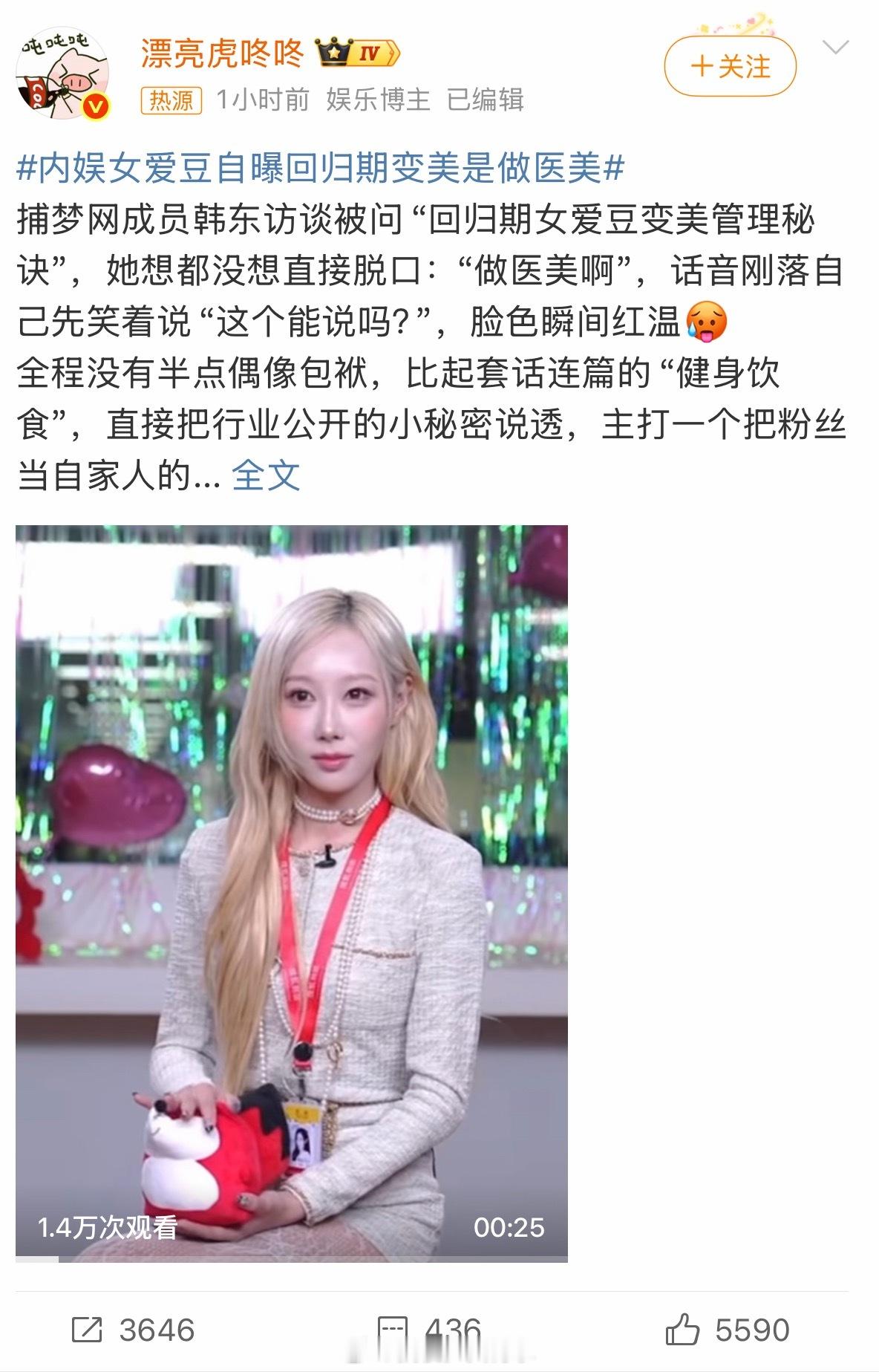 内娱女爱豆自曝回归期变美是做医美自曝了一个人尽皆知的秘密,现在微调没什么奇怪的,整了就整了,该喜欢一样的喜欢,就是不理解那些大家都看出来整了还死不承认明星,有啥不能说的,整容在娱乐圈又不是秘密