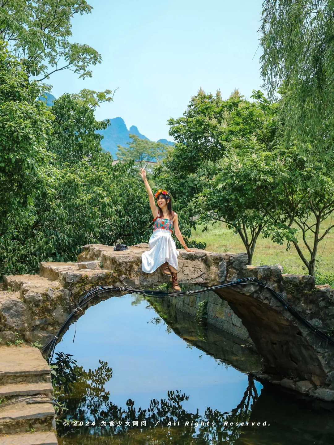 500多年历史的古老石桥,两旁是翠绿的古树,竹筏穿行而过,人走在桥上特别像幅画