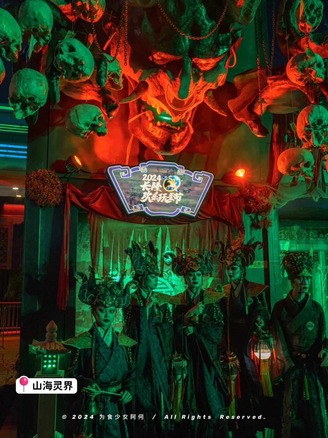 南门进来就是山海灵界入口,有6号戏台、森林神庙、罗刹山谷、丧地月台4个鬼屋