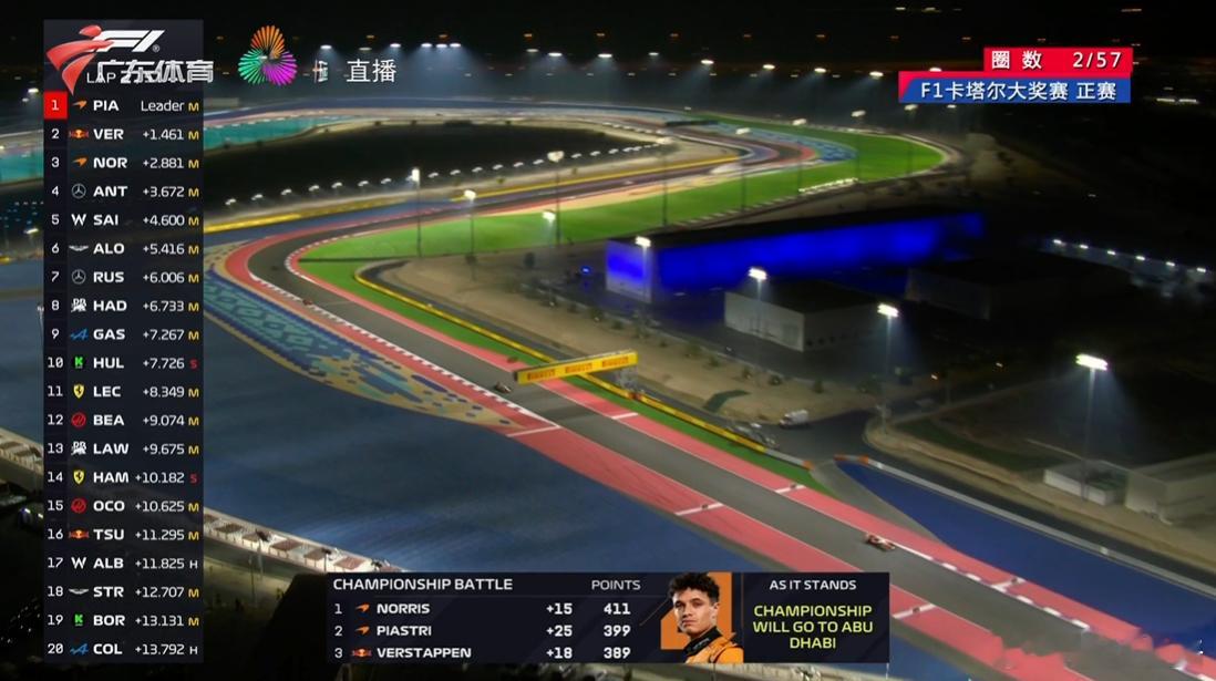 一起步,PIA保持领先,VER超了NOR如果按这排名结束就等到下一场决出世界冠军2025F1卡塔尔大奖赛