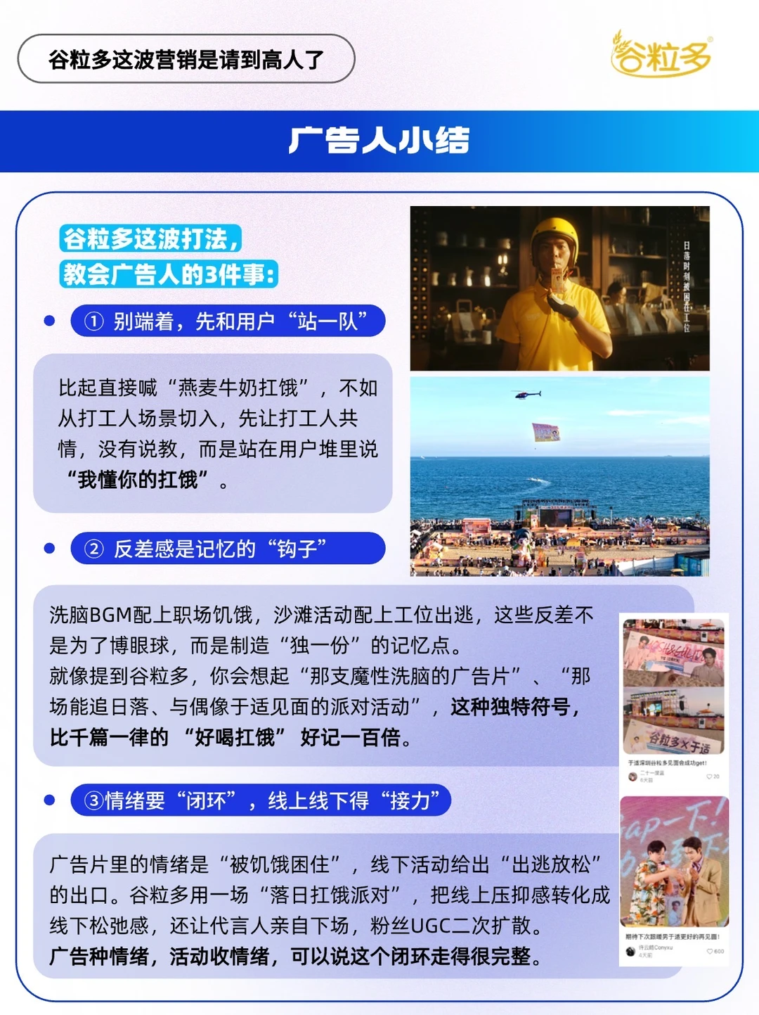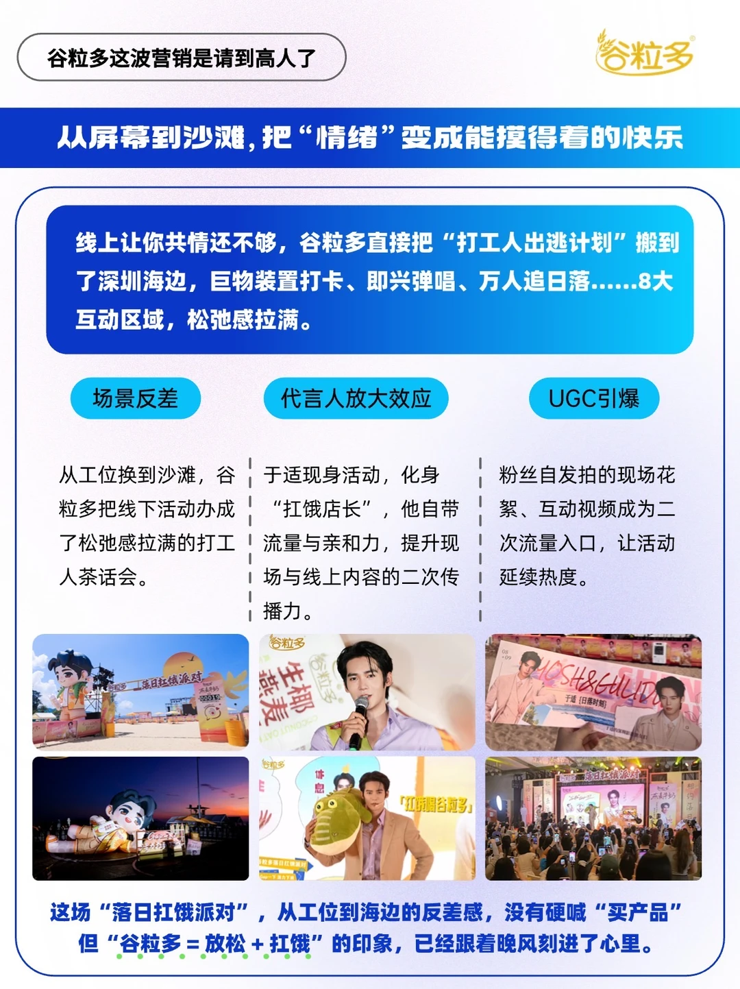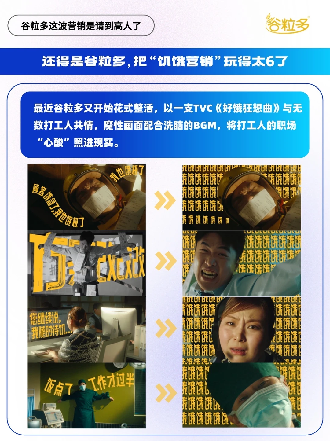 - 这年头,品牌都在卷“卖点”, 谷粒多却在卷“懂你”。 当大多数饮品广告还在对着成分表念参数时,它甩出一支《好饿狂想曲》,用魔性画面配合洗脑的BGM,唱透了打工人的饥饿日常; 当线上共鸣还没降温,它转身又携手代言人于适,把日落时分的“工位出逃计划”搬进深圳海边,让“扛饿”从屏幕里的词变成沙滩上的快乐。 这波操作没有硬喊“买我”,而是变身成为打工人抽屉里的“职场搭子”,让无数人在笑出声时记住了“饿了找谷粒多”~[得意R] 不得不说,谷粒多这波营销是真的请到了“懂人心”的营销高手~[赞R]
