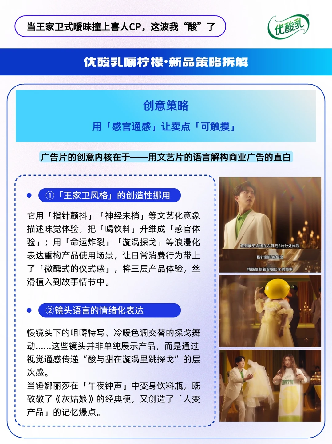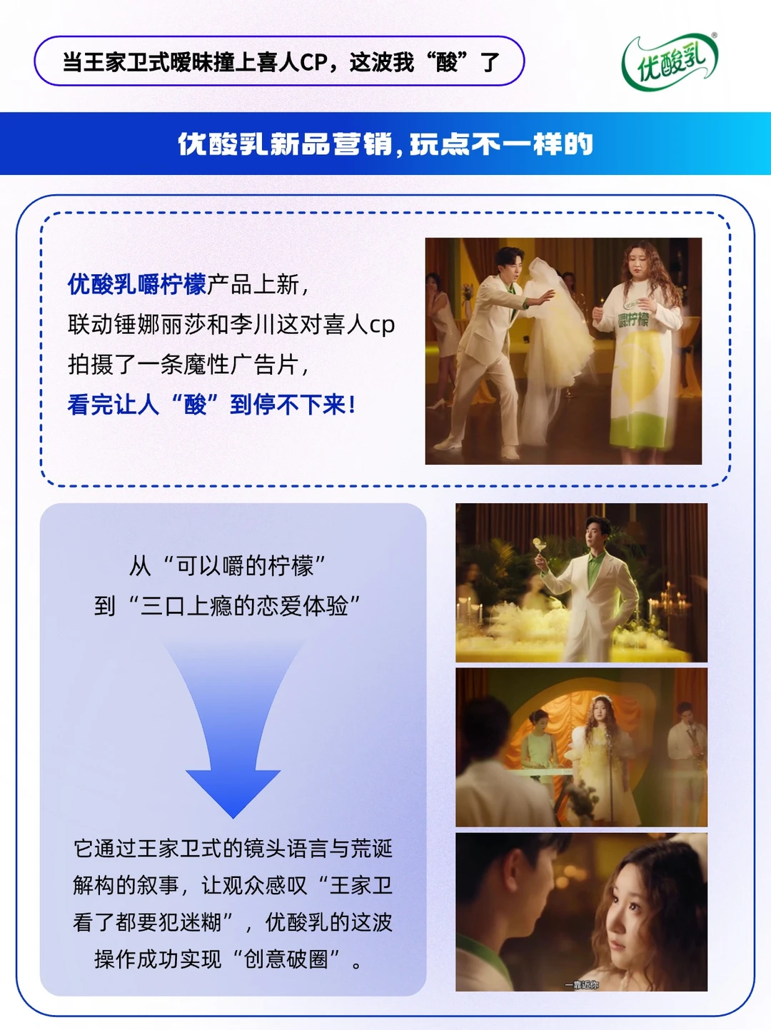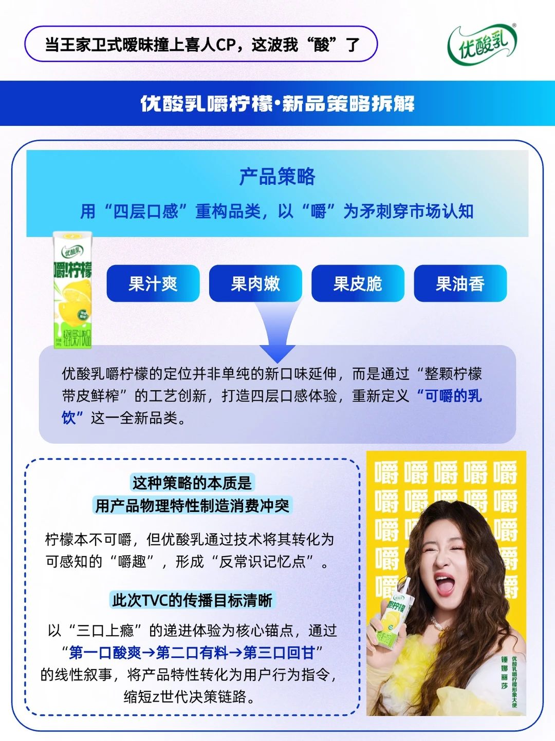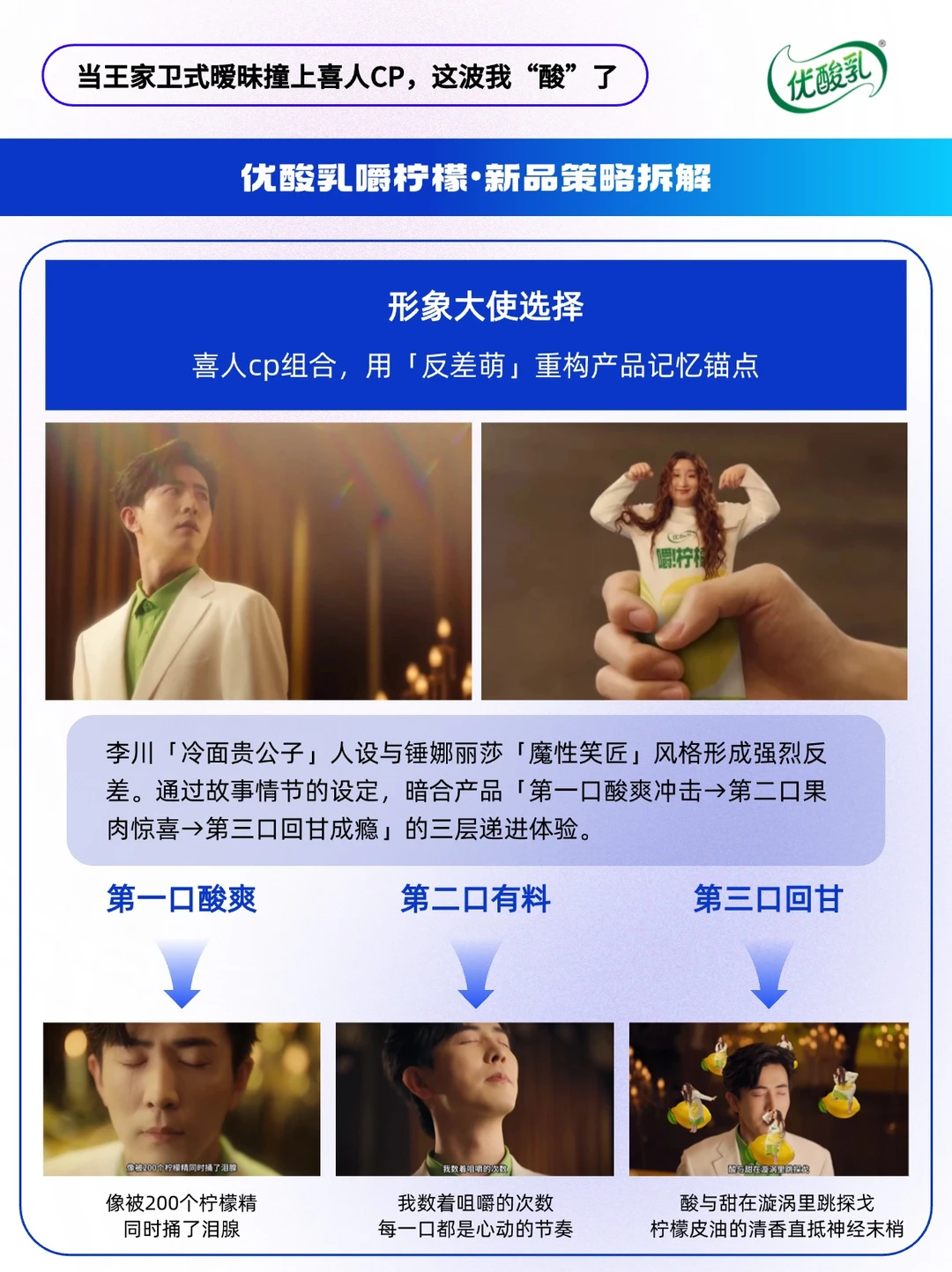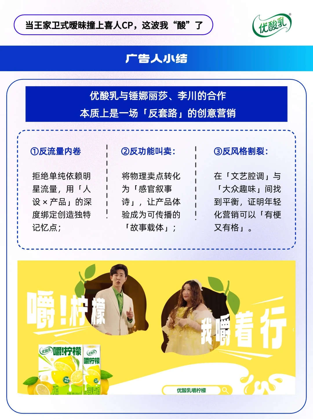 - 在快消品广告陷入「流量堆砌」与「洗脑循环」的同质化困境时,新品营销还能怎么做?🤔 优酸乳新品「嚼柠檬」另辟蹊径——联动「冷面男神」李川与「喜剧担当」锤娜丽莎,以王家卫式文艺腔调混搭魔性喜剧基因,打造出一支「酸中带梗,甜里藏巧」的破圈 TVC。 🔴这场「反常规」的营销组合拳,精准传递了产品「三口上瘾」的核心卖点,以年轻化营销轻松植入心智,撬动z世代的“嚼瘾”。 🔵本期内容速览: ①从产品到心智,打造记忆点 ②产品策略 ③选人策略 ④创意策略 ⑤广告人小结
