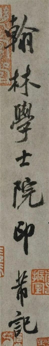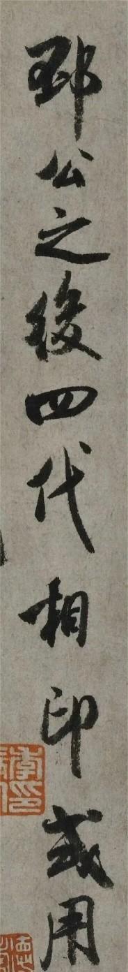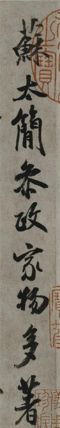 米芾手札选 《参政帖》,又称《苏太简参政帖》,纵19.6厘米,横6.8 厘米,行书三行,27字,上海博物馆藏。此帖与《苕溪诗帖》等俱为其中年成熟书风的代表作品。 释文:苏太简参政家物,多著,邳公之后四代相印,或用,翰林学士院印。芾记。