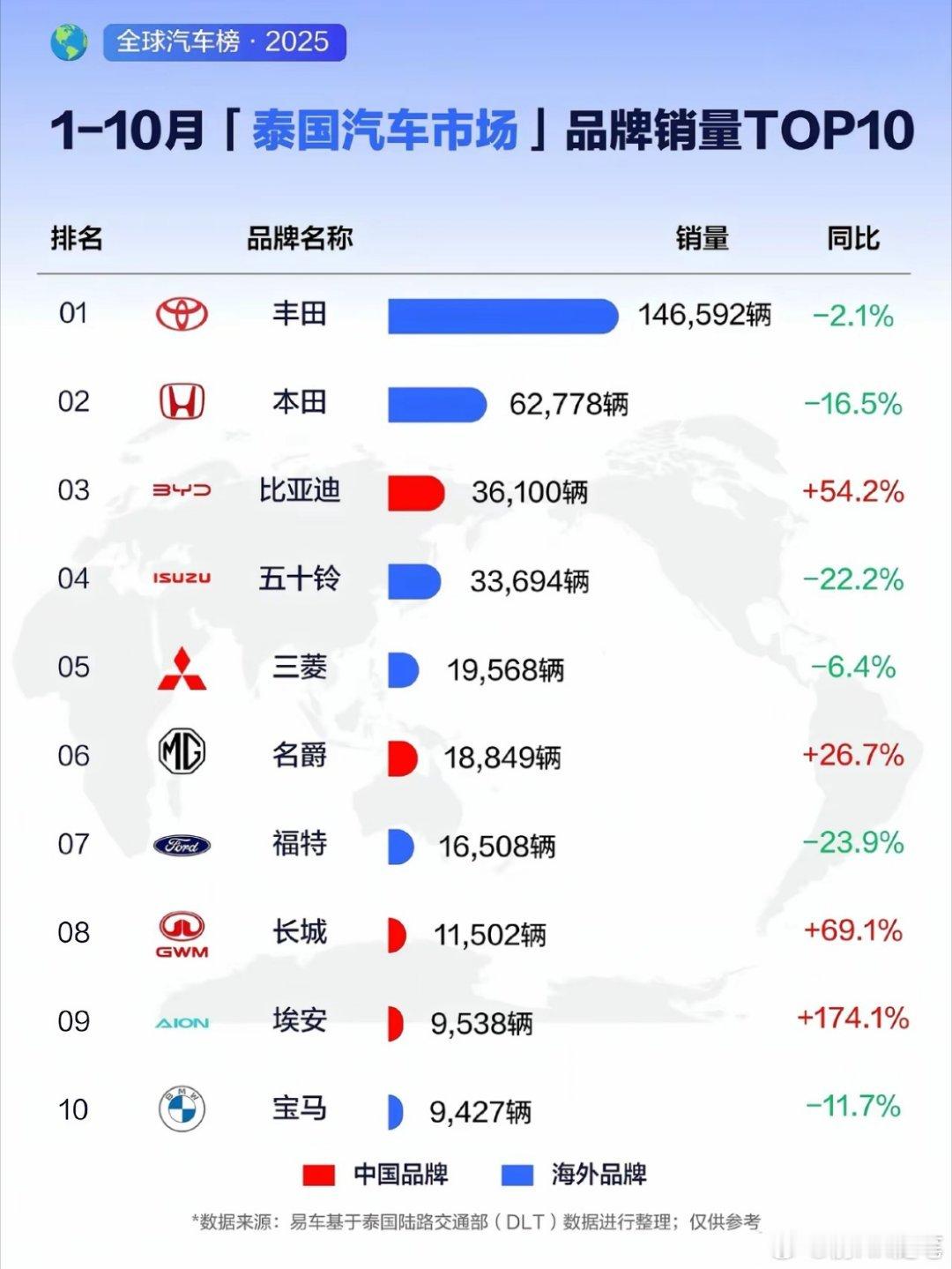 中国车企逆袭东南亚,到海外去,到发展中国家去!泰国交通部公布的 2025 年 1-10 月汽车销售榜单,恰似一面折射全球产业变局的镜子:十大畅销品牌中,中国与日本各占 4 席,美、德各分 1 席。更具标志性的是,中国品牌清一色实现大幅增长,而欧美日品牌集体陷入下滑。这次不是偶然的区域市场波动,而是中国制造业全球竞争力崛起的必然结果。也清晰指向一个明确方向,车企拓展到海外去,到发展中国家去,别在国内卷,国外抢市场去!中国汽车、家电等产业的硬核竞争力,早已具备征服全球自由市场的底气。在汽车领域,比亚迪、广汽等企业凭借新能源技术突破与成本控制能力,在泰国市场实现电动出租车销量登顶,纯电动车占比首次超越燃油车 ;家电行业中,海尔、美的等龙头海外营收占比快速提升,美的对东南亚白电出口同比增长超过国内,中国品牌正持续挤压日韩企业份额 。经过多年努力,中国产品早已摆脱“廉价标签”,以“中国智造”的实力在自由竞争中站稳脚跟。发展中国家庞大的市场需求与开放的竞争环境,正是中国企业释放产能、扩大份额的最佳舞台,放开手脚主动出击,将竞争力转化为市场话语权,最终提升中国产业链占比。出海掘金,也是破解国内利润瓶颈、掌握产业链主导权的关键一招。国内市场同质化竞争加剧导致利润率承压,而海外市场尤其是发展中国家,不仅能获得更高的盈利空间,更能实现“整机带链条”的战略突破。中国汽车品牌在东南亚逐步替代日系燃油车,宁德时代等电池企业的海外布局便水到渠成;中国家电占据中东、非洲、南美主流市场,上游的电机、芯片等配套产业也随之出海。击溃欧美日整机品牌抢占市场份额并带动产业链提升,已在泰国市场得到印证。新能源全产业链的代际优势,为中国企业抢占发展中国家市场提供了不可错失的机会窗。锂矿加工、固态电池技术、电机电控、智能座舱、智能驾驶,中国在新能源汽车全链条实现了“从跟跑到领跑”的跨越,主流车企零部件本地化率超 90%,充电基础设施密度更是全球领先 。这种优势在发展中国家市场尤为突出,中国企业已能提供“车+桩+服务”的一体化解决方案;趁着日系车企电动化转型迟缓,中国品牌凭借高性价比的智能电动车赢得当地消费者青睐。数据显示,中国汽车出口量已达日本的 1.6 倍,在发展中国家的市场份额正以年均两位数增速扩张,预计到 2030 年可能占据中国以外全球 30%的市场份额 。泰国车市的逆袭只是起点,亚非拉等发展中国家正成为中国制造业的新蓝海。到海外去,到发展中国家去,那里有广阔的市场空间,有重塑全球产业格局的历史机遇,更有中国品牌走向世界的无限可能,最终让中国牢牢掌握全世界产业链中心位置!