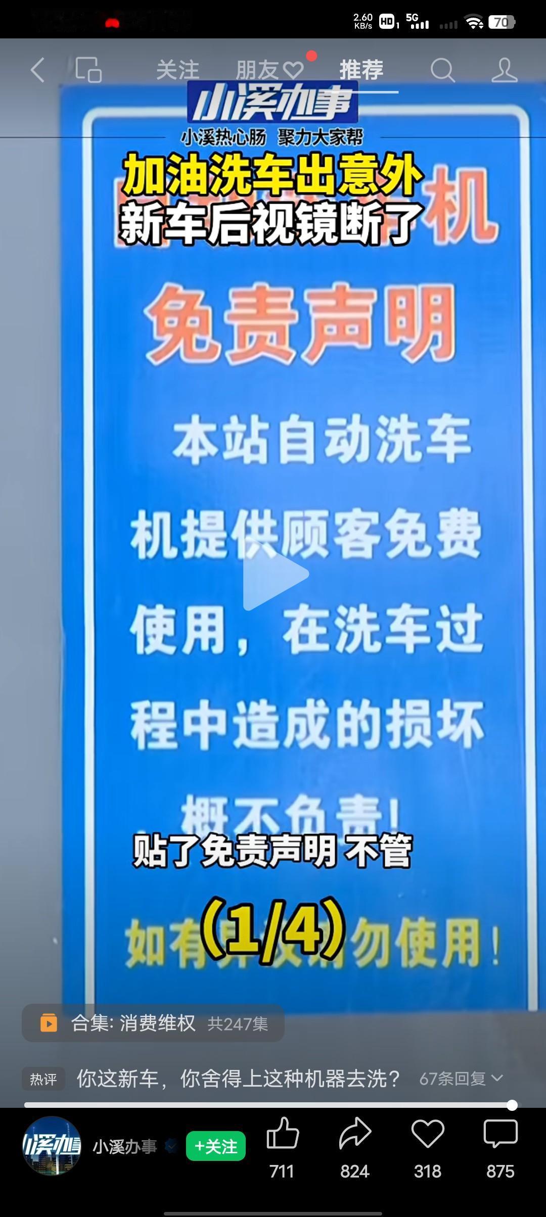 加油洗车出意外,新车后视镜断了。 车主:当时他们指挥的停车,停车的方向也对,当时我停车熄火把后视镜折起来了。他们有一个工作人员出来给我洗车,是他们操作,在操作过程中,我的后视镜被洗车机给打掉了。他们说是我车的质量问题。说后视镜本来有裂痕啊什么的,我的车刚提了六天是新车,不可能坏的。 洗车老板:我们贴了免责声明,本站自动洗车机提供顾客免费洗车,在使用过程中造成的损坏,概不负责。 我觉得这个事还挺难办的,在加油站是免费洗车,而且还贴了免责声明,在洗车过程中造成的损坏概不负责。你看这像不像人家在免费施粥喝粥的人给噎死了,反过来怪施粥的人。我想请教一下,有懂得法律的人,麻烦出来科普一下!谢谢。