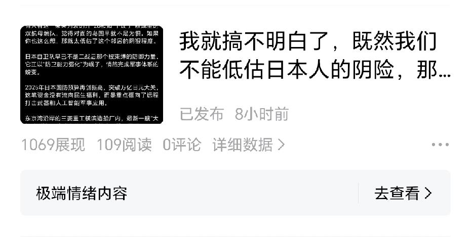 我这篇头条怎么就变成了极端情绪呢? 我只是实事求是地发出一些疑问而已,只是希望有网友能给我一些答案而已。 我更希望那些所谓的大V能给我解释一下他们的言论。 这里面哪个字带着极端的情绪? 我是有些搞不懂后台的审核机制。