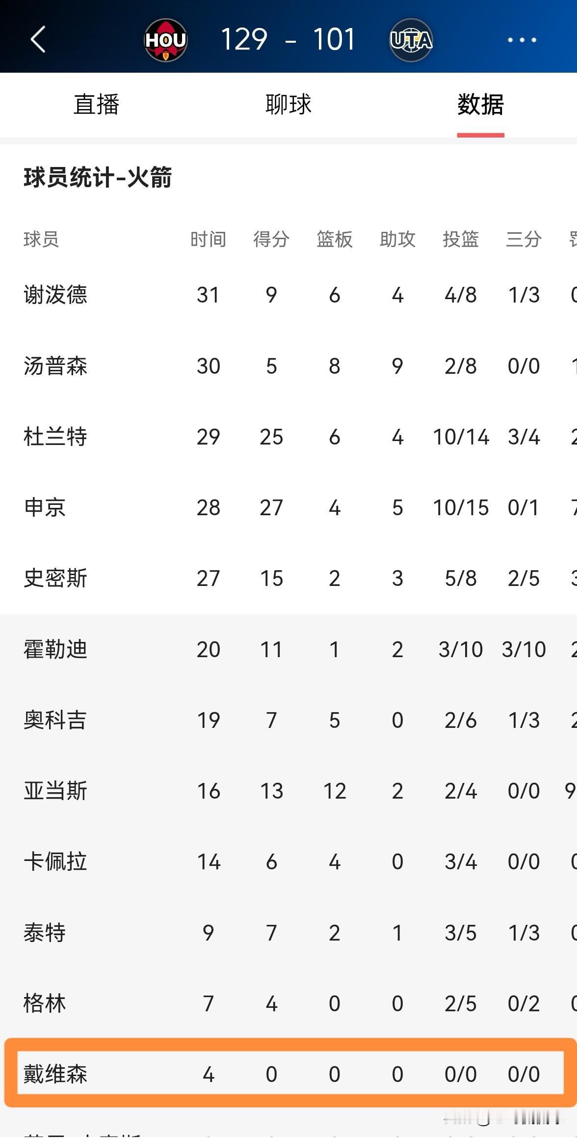 火箭小将戴维森真是太谦让了!在今天火箭客场以129:101击败爵士的比赛中,戴维森替补出战4分钟,竟然没有出手怒砍0分0篮板0助攻0抢断0盖帽,不过有1失误和1犯规。 值得一提的是,戴维森是火箭上场球员中唯一没有出手的球员,这家伙在场上真是太谦让了。