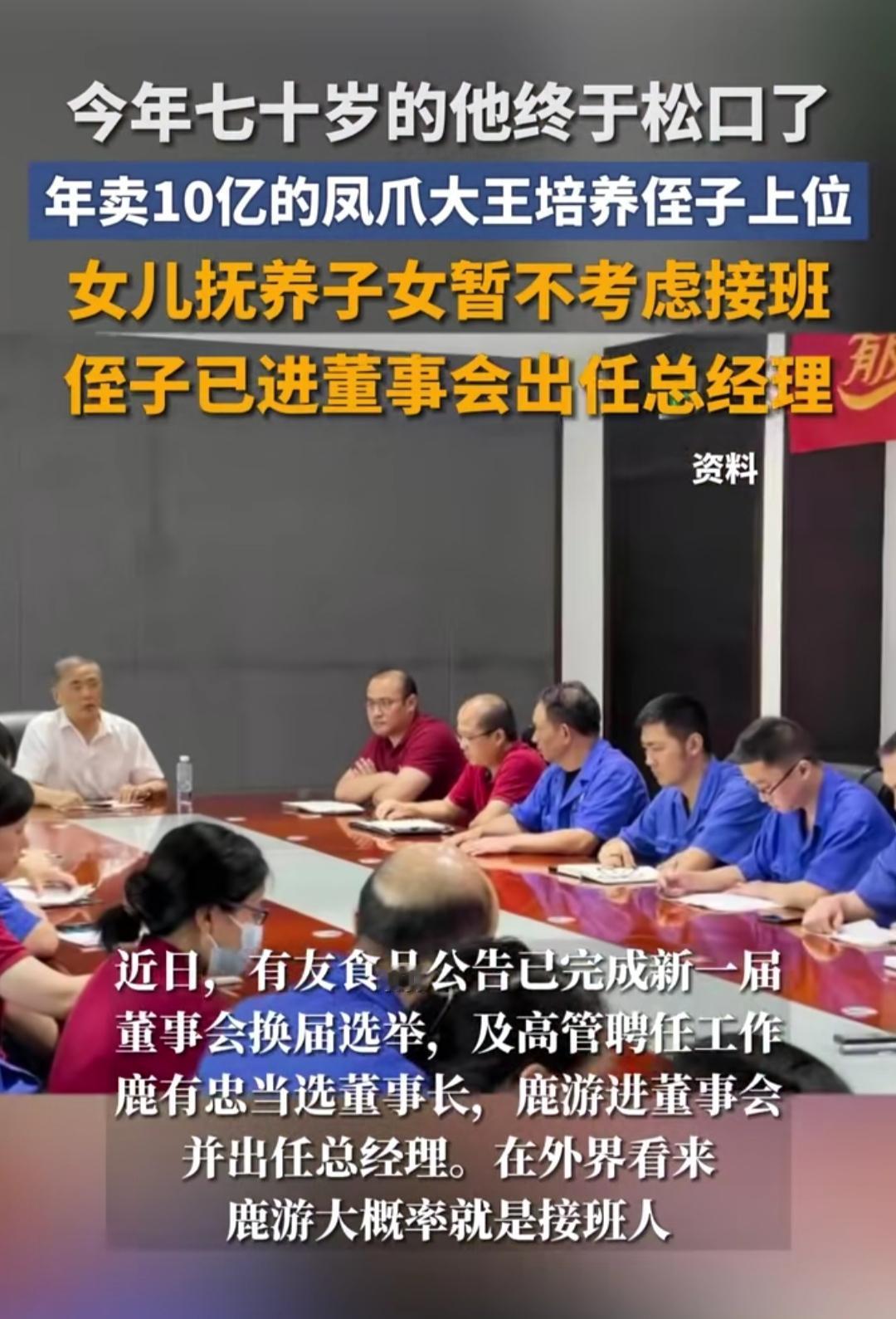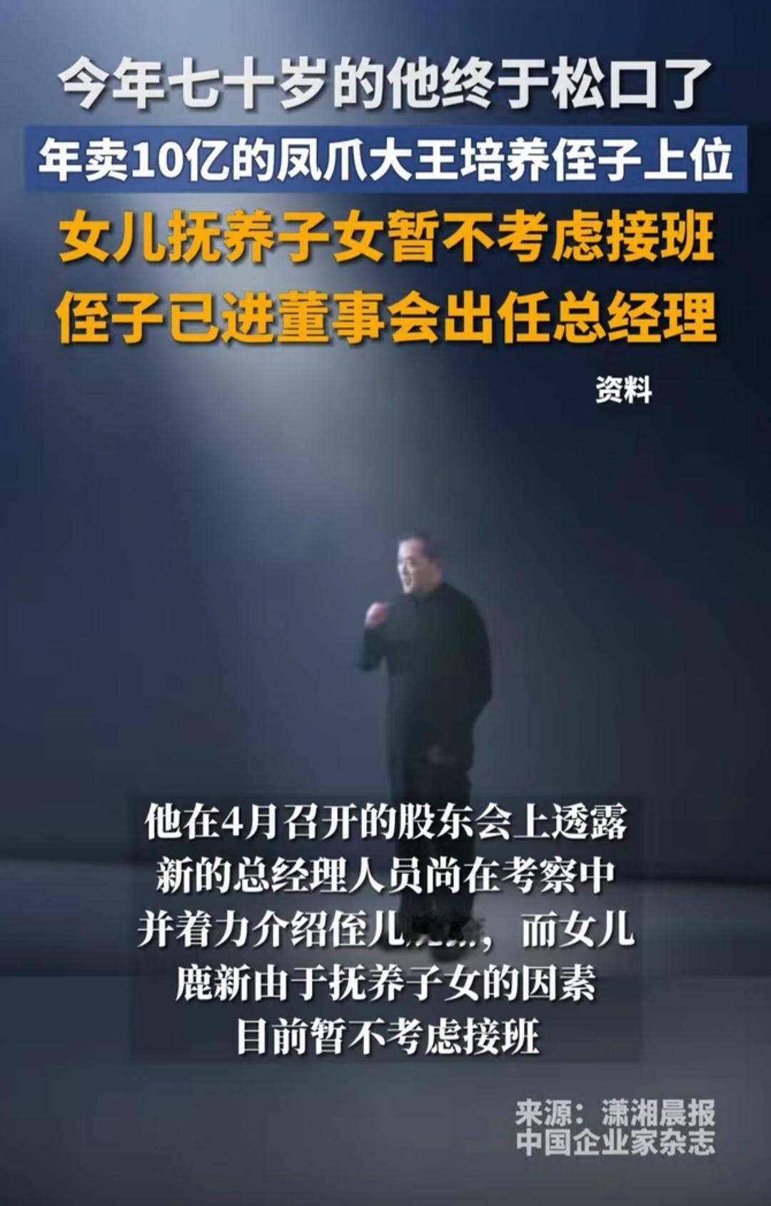 70岁本该含饴弄孙享清福,可这位年销10亿的“凤爪大王”却刚敲定接班大事,既没选女儿也没找外人,偏偏把重任交给了侄子。 这事一曝光,网上吵翻了天。有人说重男轻女,有人猜女儿不愿接手,可谁懂老一辈创业者的两难?一手把小作坊做成十亿品牌,每袋凤爪都藏着几十年的心血。 选女儿怕她扛不住市场压力,选外人又不放心自家招牌,侄子跟着自己打拼多年,知根知底更靠谱。这哪里是选接班人,分明是在守一份家业,护一群跟着自己吃饭的员工。 其实不管选谁,老一辈的坚守都让人动容。生意场上的取舍,藏着的全是责任与牵挂,这大概就是中国式创业者的底色吧。