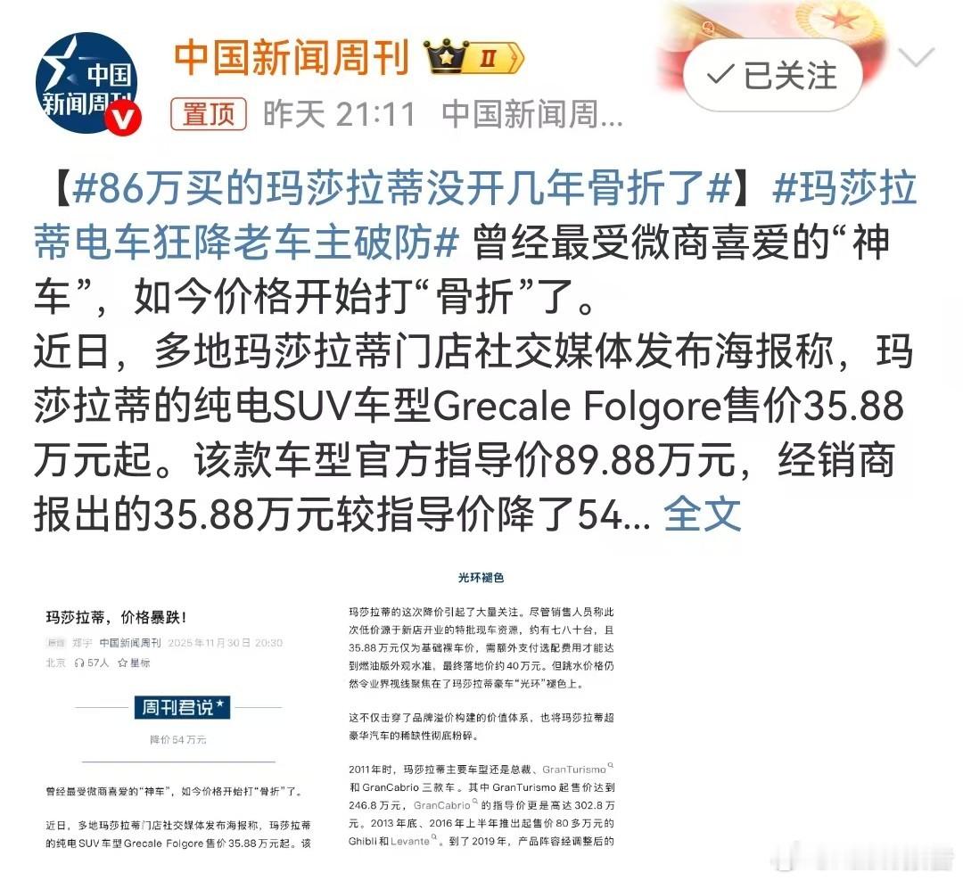 玛莎拉蒂电车狂降老车主破防玛莎拉蒂电车狂降54万,既伤了老车主的心,也碎了超豪华品牌溢价。核心是产品力跟不上新能源浪潮,智能化、续航短板明显,又遇中国品牌围堵。靠“以价换量”难长久,不补硬实力恐真成时代眼泪。