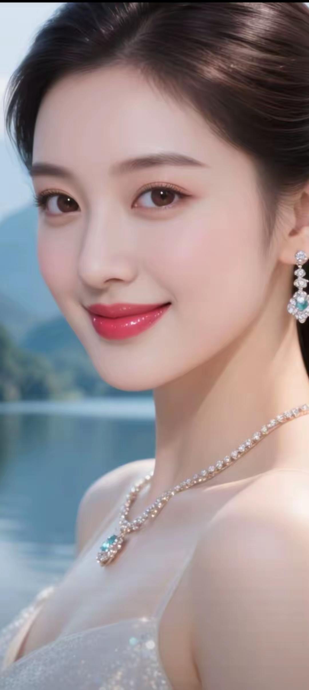 优雅黑发美人,闪耀珠宝项链,红唇白裙,气质非凡!