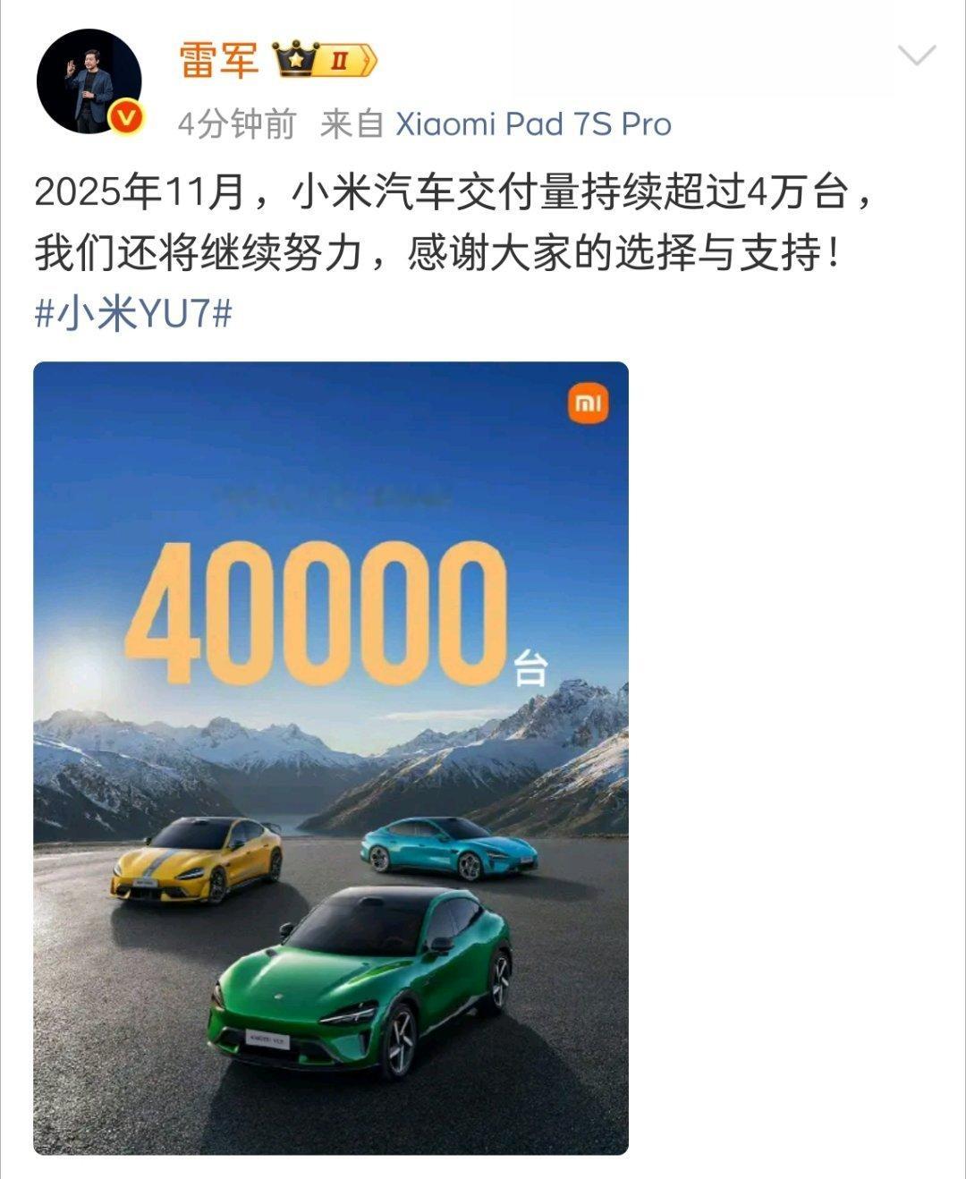 雷军说,“小米YU7凭借卓越的能耗管理,成为全场跑得最远的车型,而小米SU7是最