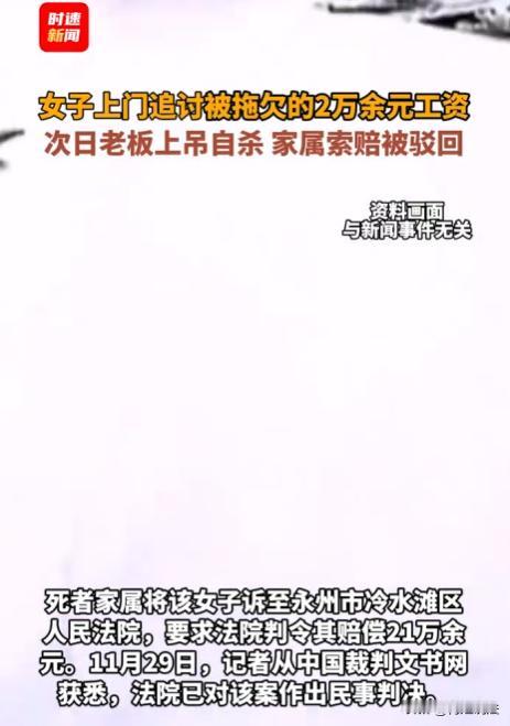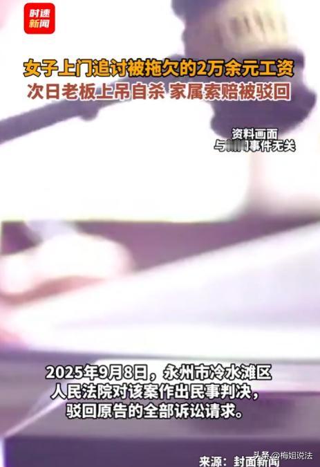 湖南永州,一女子被欠薪20000元,5年都没要回来,女子实在忍不下去,某晚,征得老板同意后上门讨薪,和老板夫妻发生争吵,第二天老板自缢离世,家属觉得是女子讨薪刺激了老板,导致他轻生,于是把女子告上法院,索赔21万,最后法院这样判了。 据时速新闻、封面新闻报道,况女士,2017年入职李先生的教育公司,没签合同,但工作认真,也很顺遂。 起初公司运营正常,工资按时发。 可从2020年起,工资开始延迟发放,后来拖欠时间越来越长,不少员工离职,况女士却一直坚守。 到2024年3月,她实在撑不下去,家里老小都需要钱,她提出离职,此时已被欠2万多元工资。 况女士离职后,期待着公司能结算那2万多元的工资欠款,毕竟这是她辛苦工作赚的钱。 可公司却像没事了一样,压根不提结算工资的事。 况女士着急,多次打电话催要,每次李先生都找各种理由推脱。 一会说公司资金周转困难,让况女士再等等,一会又说等有新项目进账了,第一时间给她发工资。 况女士想着李先生也不容易,一次次的就选择了相信李先生。 到了2024年9月,李先生脑 梗 了。 况女士得知后,她担心李先生的身体,想着自己的工资这下应该更不好要了。 考虑到李先生生病了,况女士就没过多催促,想着等他身体好点了再说。 几个月后,到了2025年3月2日晚上,况女士实在忍不下去了,家里老人看病要钱,孩子上学要钱,处处都需要钱,可工资却一直没着落。 于是,她征得李先生同意后,决定上门讨薪。 况女士来到李先生家,刚一开口说工资的事,李先生夫妻俩就情绪激动起来,双方就吵了起来。 很快,邻居听到动静后,报了警。 民警赶到,把双方带到了派出所,进行调解。 在派出所里,民警耐心劝说后,双方的情绪逐渐稳定下来。 最后达成自行协商的共识,况女士觉得事情总算有了个解决的方向,就回家了。 可谁能想到,第二天一大早,一个噩耗传来,李先生自缢离世了。 李先生的家属认为:是况女士上门讨薪刺激了李先生,导致他轻生,于是起诉了况女士,索赔21万。 这下,况女士彻底懵了。 她怎么也没想到,自己合法讨薪,却惹上这么大的麻烦。 她觉得自己太冤了,明明是李先生拖欠工资在先,自己只是要回属于自己的钱,怎么就成罪人了呢? 这事,在网上也引发了网友的热议,大家都在讨论,况女士到底该不该承担责任。 有人觉得况女士太倒霉了,讨薪是正当行为,不应该赔偿。 也有人说况女士讨薪的方式可能有些过激,对李先生造成了影响,应该承担一定责任。 那么,从法律角度看,况女士到底该不该赔偿呢? 民法典里规定,行为人因过错侵害他人民事权益造成损害的,应当承担侵权责任。 这里说的过错,包括故意和过失。 李先生是成年人,他应该能判断自己行为的后果。 自缢是他自己选择的,是他对自己生命权的处分。 况女士上门讨薪,这是她维护自己合法权益的正当行为。 虽然双方在讨薪过程中发生了争吵,但这并不足以导致李先生轻生。 讨薪和自缢之间,没有法律上的因果关系。 况女士没有故意或者过失侵害李先生的民事权益,所以,不应该承担侵权责任。 《劳动法》规定,劳动者有取得劳动报酬的权利,用人单位应当按照劳动合同约定和规定,向劳动者及时足额支付劳动报酬。 况女士为李先生的公司工作,李先生拖欠她工资,本身就违反了法律规定。 况女士讨薪是合理合法的,她的行为,是受到法律保护的。 有人说,况女士讨薪时和李先生争吵,可能对李先生造成了刺激。 但法律上认定侵权责任,不能仅仅因为有可能造成刺激就判定有责任。 必须要证明这种刺激和损害结果之间,有直接的因果关系,而且行为人有过错。 在该事件内,根本无法证明况女士的讨薪行为和李先生自缢之间,有这种直接的因果关系。 有些人在遇到问题后,不能正确对待,心理承受能力太差。 就像李先生,因为拖欠工资被讨薪,就选择轻生,这是对自己和家人的不负责任。 应该增强法律意识,遇到问题通过合法途径解决,也要提高自己的心理承受能力,正确面对生活中的挫折。 最终,法院经过审理,认为况女士上门讨薪是合法维权行为,与李先生自缢没有法律上的因果关系,驳回了李先生家属的全部诉讼请求。 当遇到拖欠工资等情况时,要通过合法途径讨薪。 用人方也要遵守法律法规,按时足额支付员工工资。