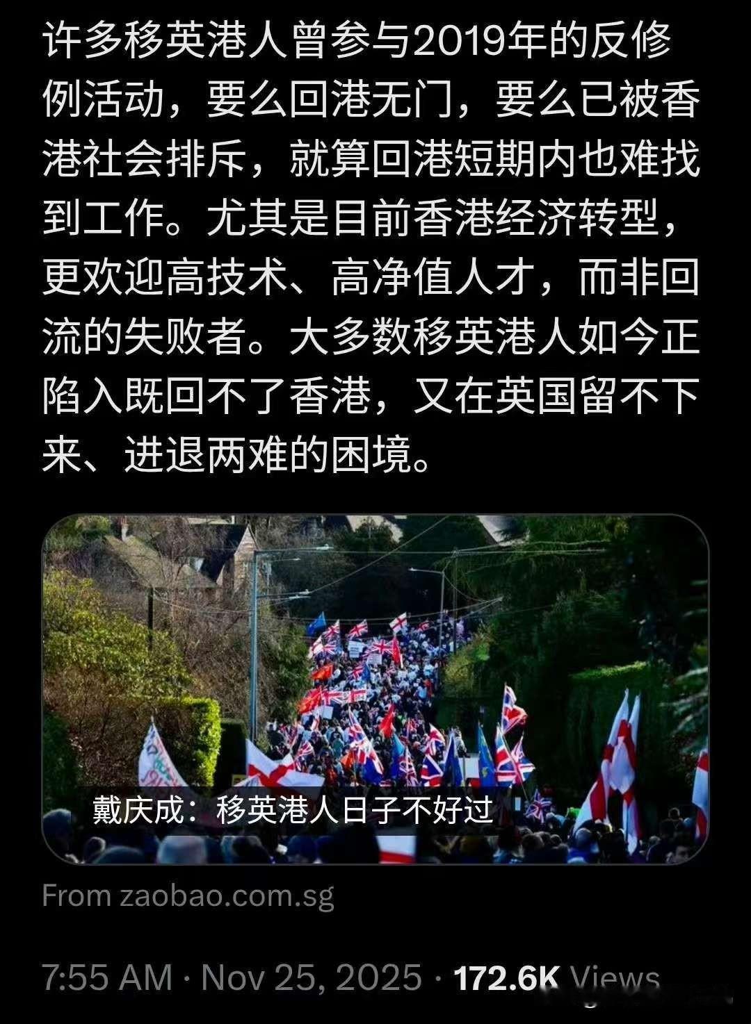 这不活该么,润人就能润尽润,还回来干嘛? 甘愿当西方乱港的马前卒和走狗,那么就要有做好走狗被随时抛弃的觉悟! 许多移英港人曾参与2019年的反修例活动,要么回港无门,要么已被香港社会排斥,就算回港短期内也难找到工作。尤其是目前香港经济转型,更欢迎高技术、高净值人才,而非回流的失败者。大多数移英港人如今正陷入既回不了香港,又在英国留不下来、进退两难的困境。