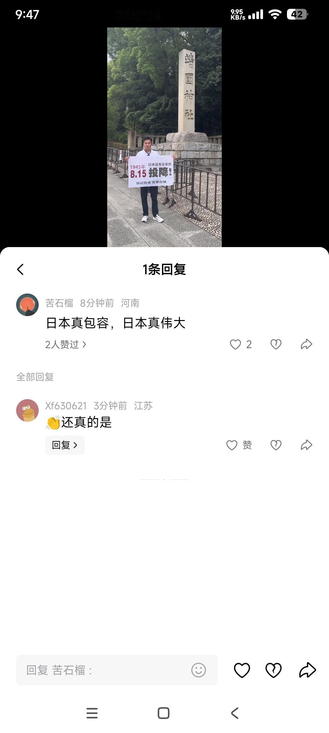 网友:日本真包容,日本真伟大! 一男子在靖国深厕前举:1985·8.15日本宣布无条件投降的横幅。 没有人过去阻止。 网友说日本真包容真伟大。 不是日本包容,日本也不伟大,这只是历史事实而已。 现在的日本不正视历史,不承认错误,跟伟大没有任何关系。 这位网友的思维真的让人无语!